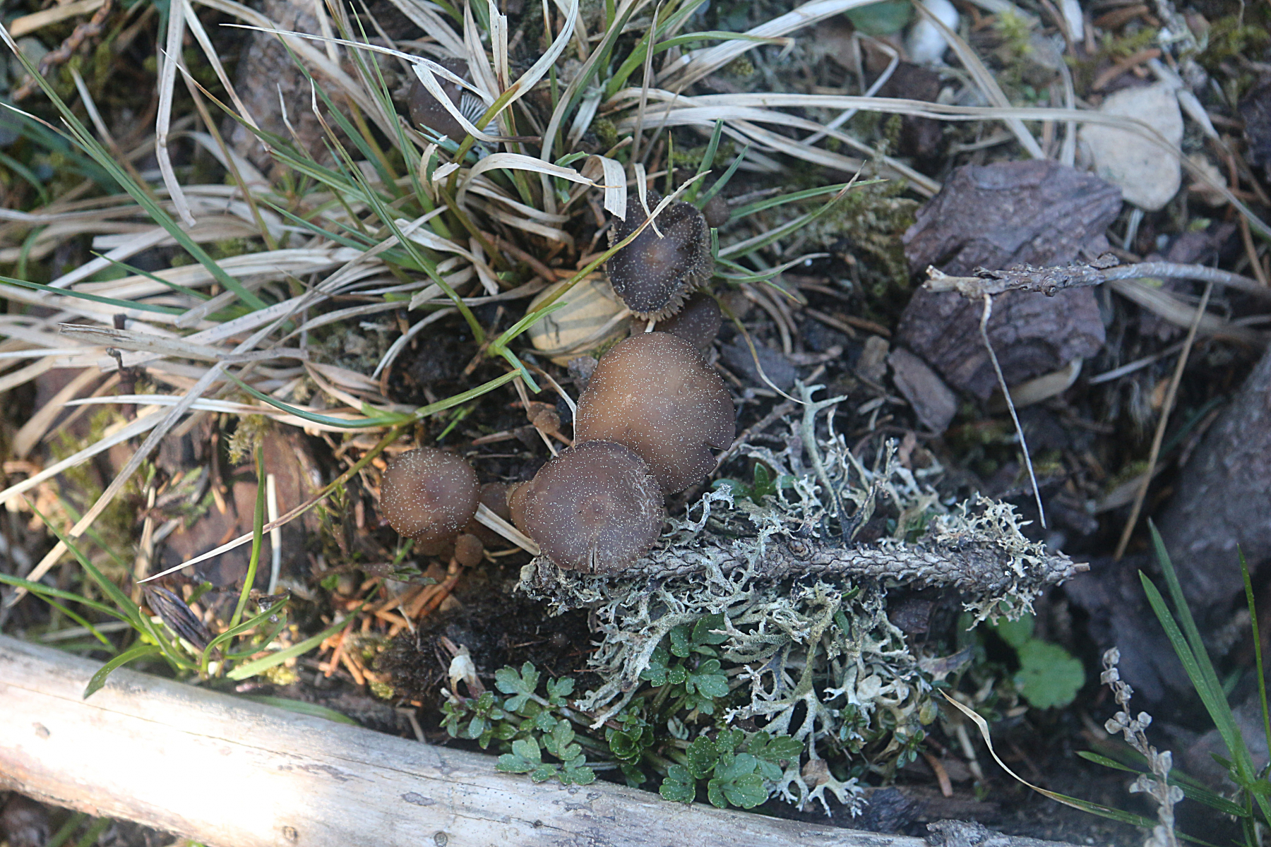Hut: bis 23 mm, dunkelbraun mit kleinem Buckel. Weißliche Pünktchen waren auf allen Exemplaren vorhanden.