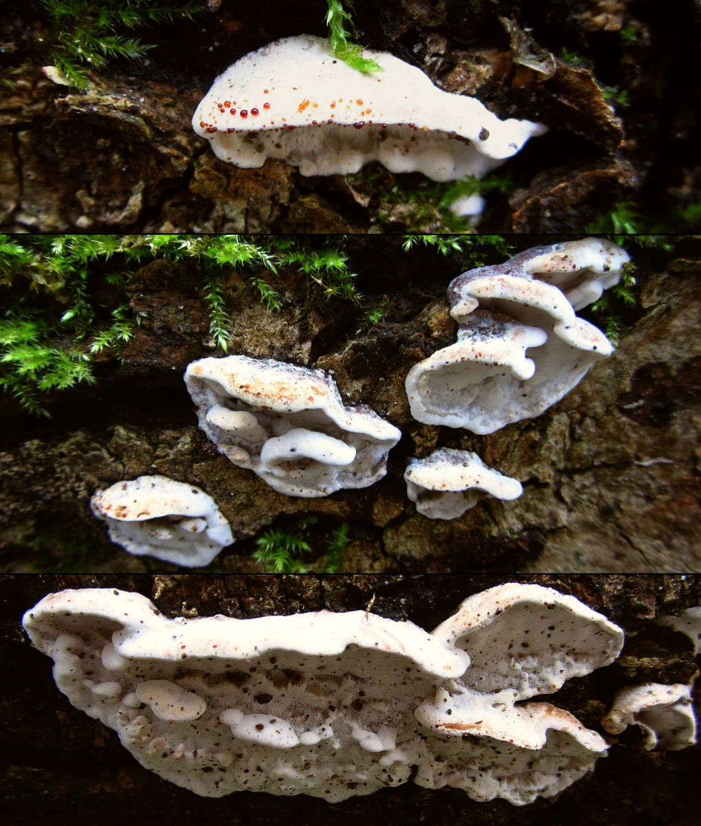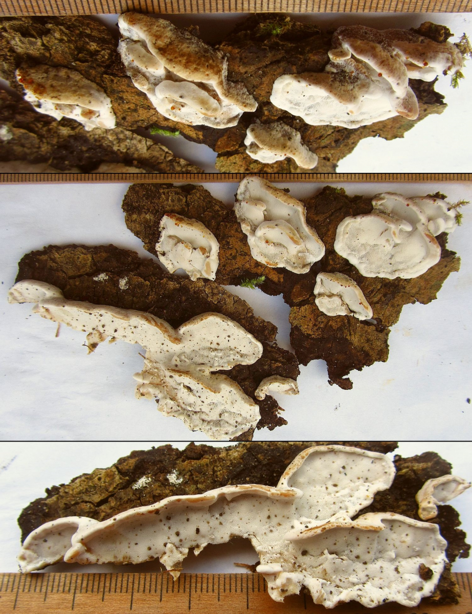 Ich kann es selbst natürlich nicht sicher erkennen, würde folgende, durchaus hübsche Kollektion aber angesichts der ökologischen Umstände (fetter, liegender Ahornstamm in einem thermophilen Auwald) aber einfach mal als Skeletocutis nemoralis vorstellen: