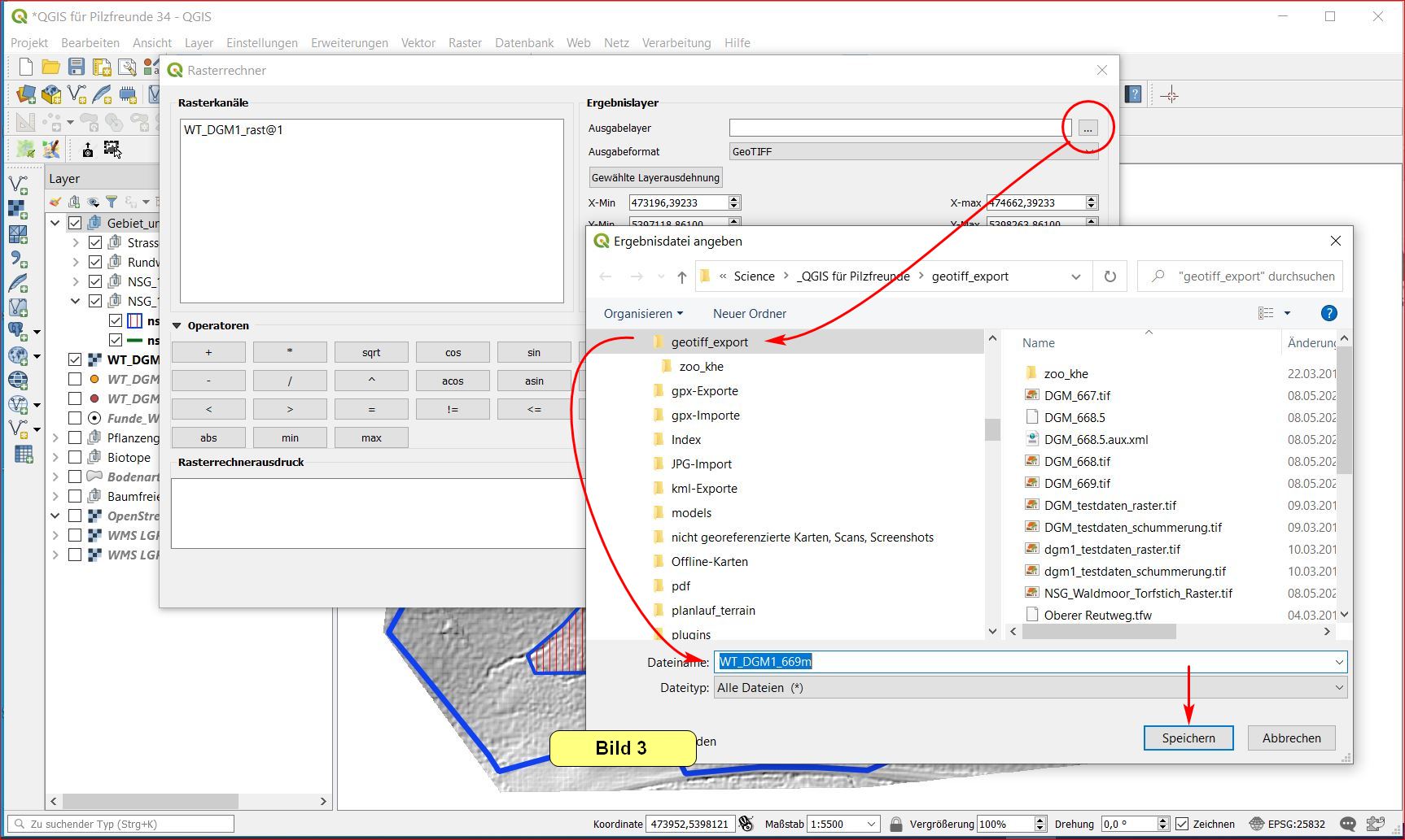 Im sich öffnenden Menü wird (für das Ergebnis des Rasterrechners) erst einmal der Browse-Button geclickt. Im sich öffnenden Untermenü manövriert man zum Ordner für die Geotiff-Exporte, trägt einen passenden Dateinamen ein und clickt auf Speichern.