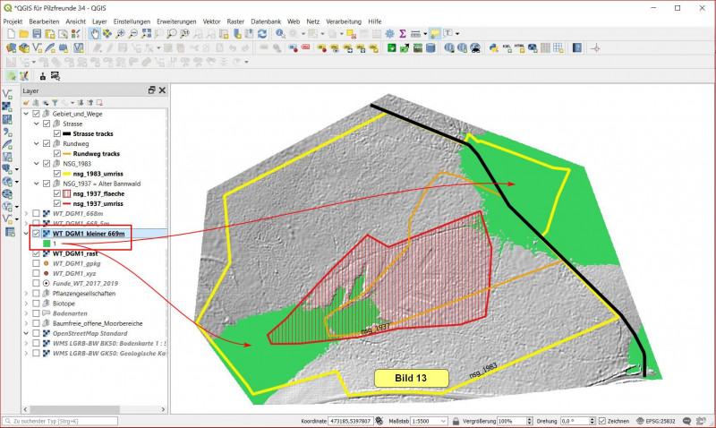 Wir optimieren nun noch den Layernamen und erhalten Ergebnis nach Bild 13. Es ergeben sich also innerhalb des neuen NSGs (gelb umrandet) zwei unabhängige feuchte-nasse-Oberflächenwasser führende Bereiche (grüne Flächen):