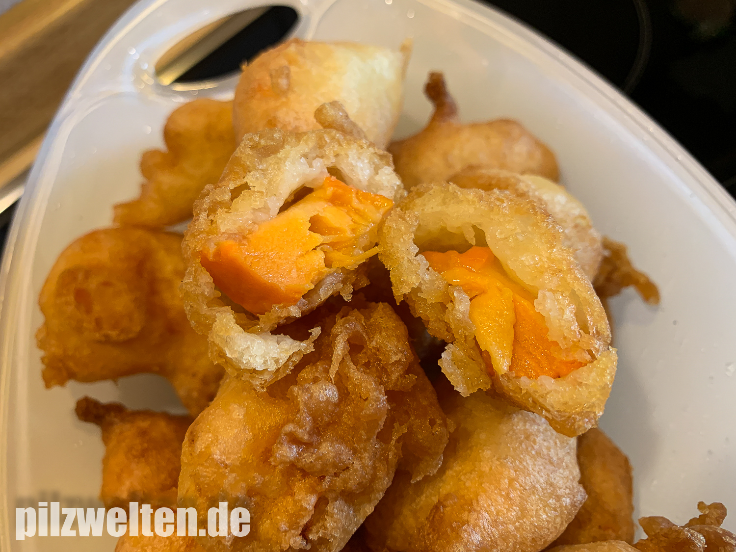 4. Die einzelnen Schwefelporlingsstücke dann durch den Teig ziehen und im Sonnenblumenöl frittieren.