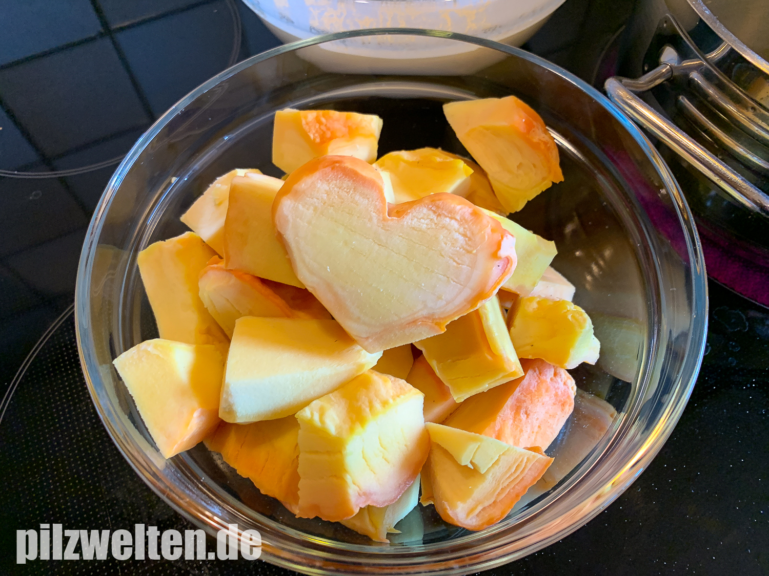 3. Den Schwefelporling putzen und in mundgerechte Stücke schneiden. Achtung: Durch den Backteig werden die Stücke deutlich größer, also lieber etwas kleiner schneiden, damit die einzelnen „Nuggets“ dann auch in den Mund passen.