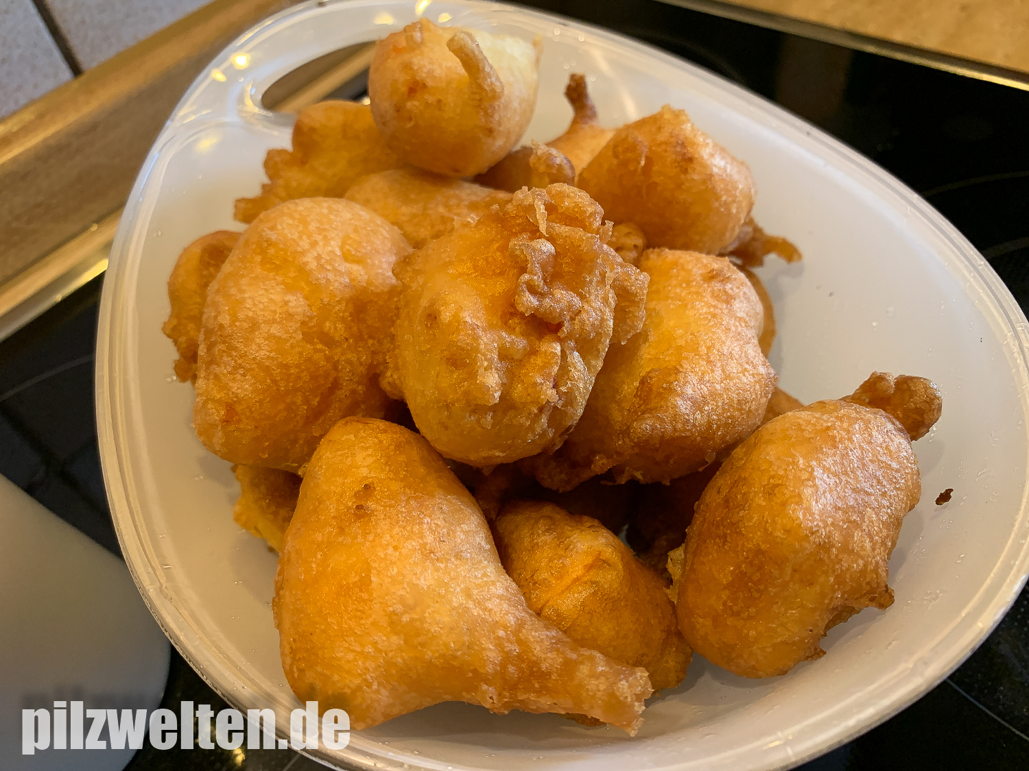 4. Die einzelnen Schwefelporlingsstücke dann durch den Teig ziehen und im Sonnenblumenöl frittieren.