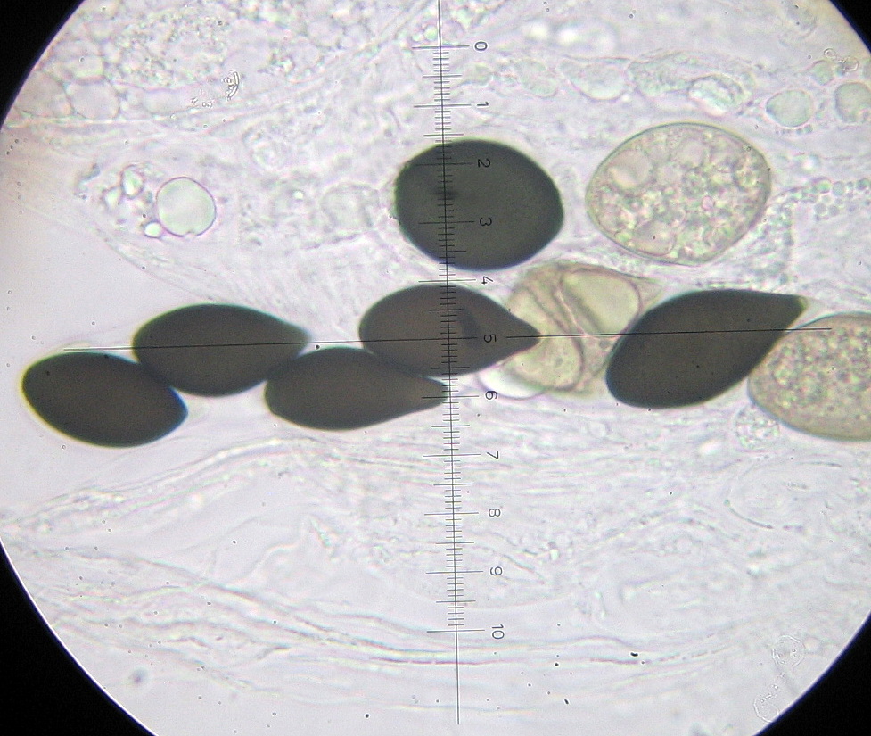 Nun sind die Sporen nicht unbedingt immer etwa gleichgroß (30-40 x 15-20µ) , relativ tropfenförmig mit einem zentralen Keimporus oder möglicher Weise auch einem winzigen hyalinen Anhängsel.