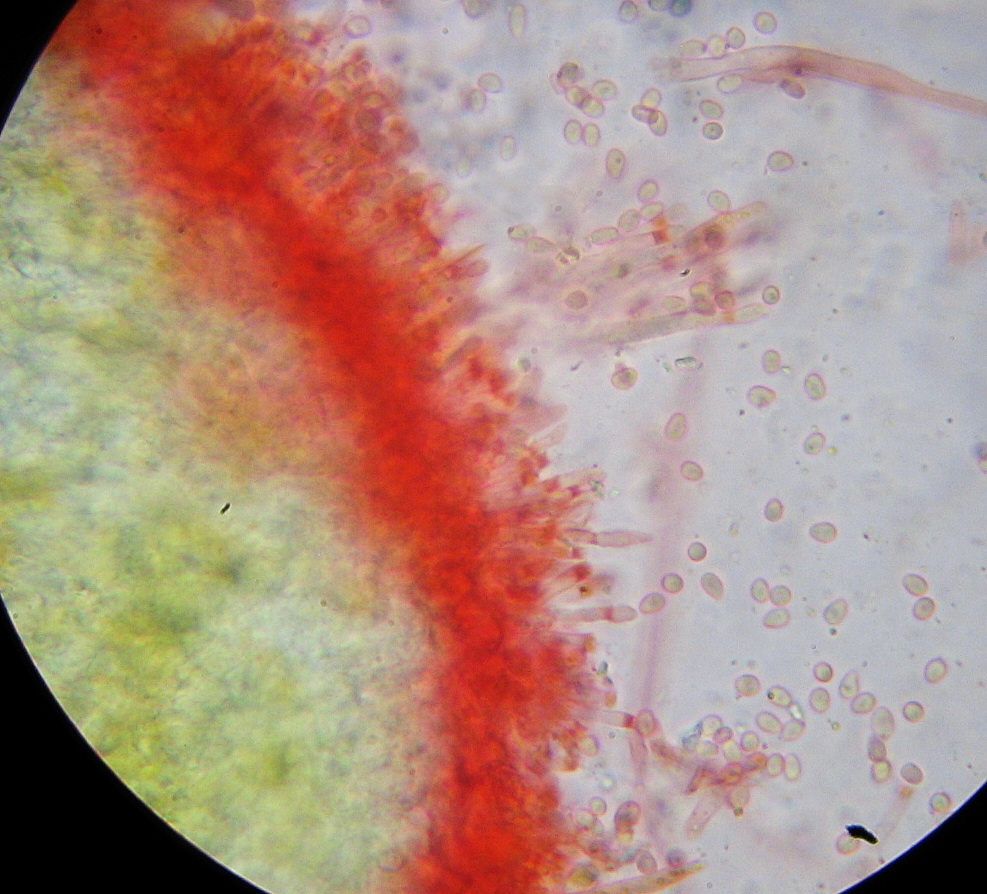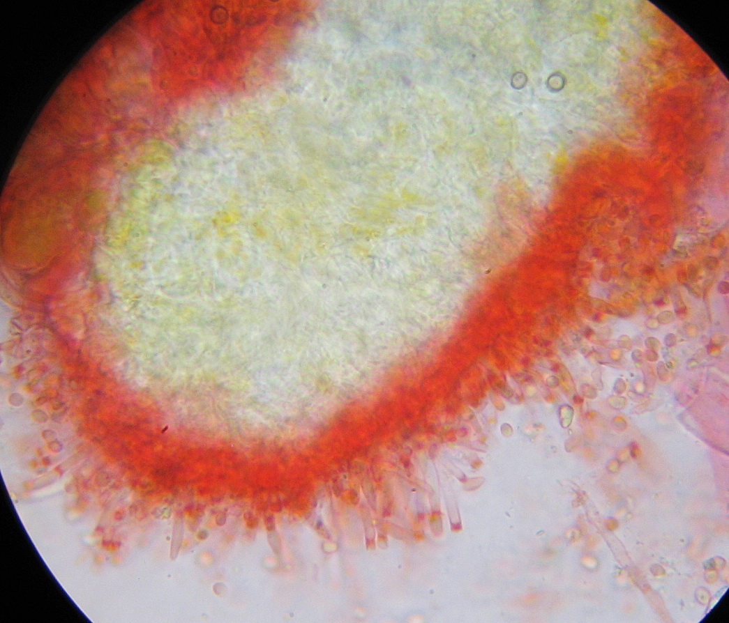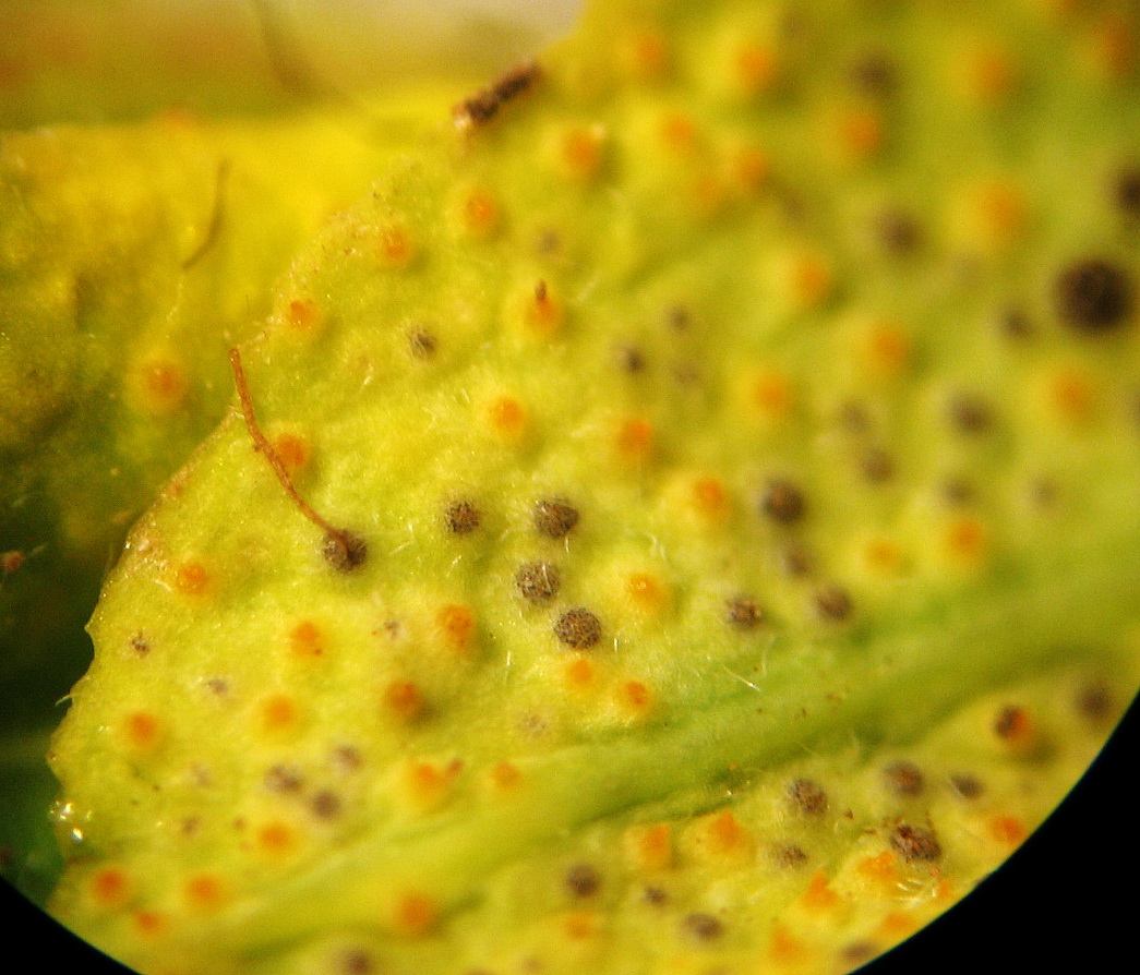Die Färbung der Blätter wird durch einen Rostpilz? erzeugt, der erst orange Punkte auf der Blattunterseite bildet ( stachelartige Auswüchse mit Phialiden und kleinen Konidiosporen),