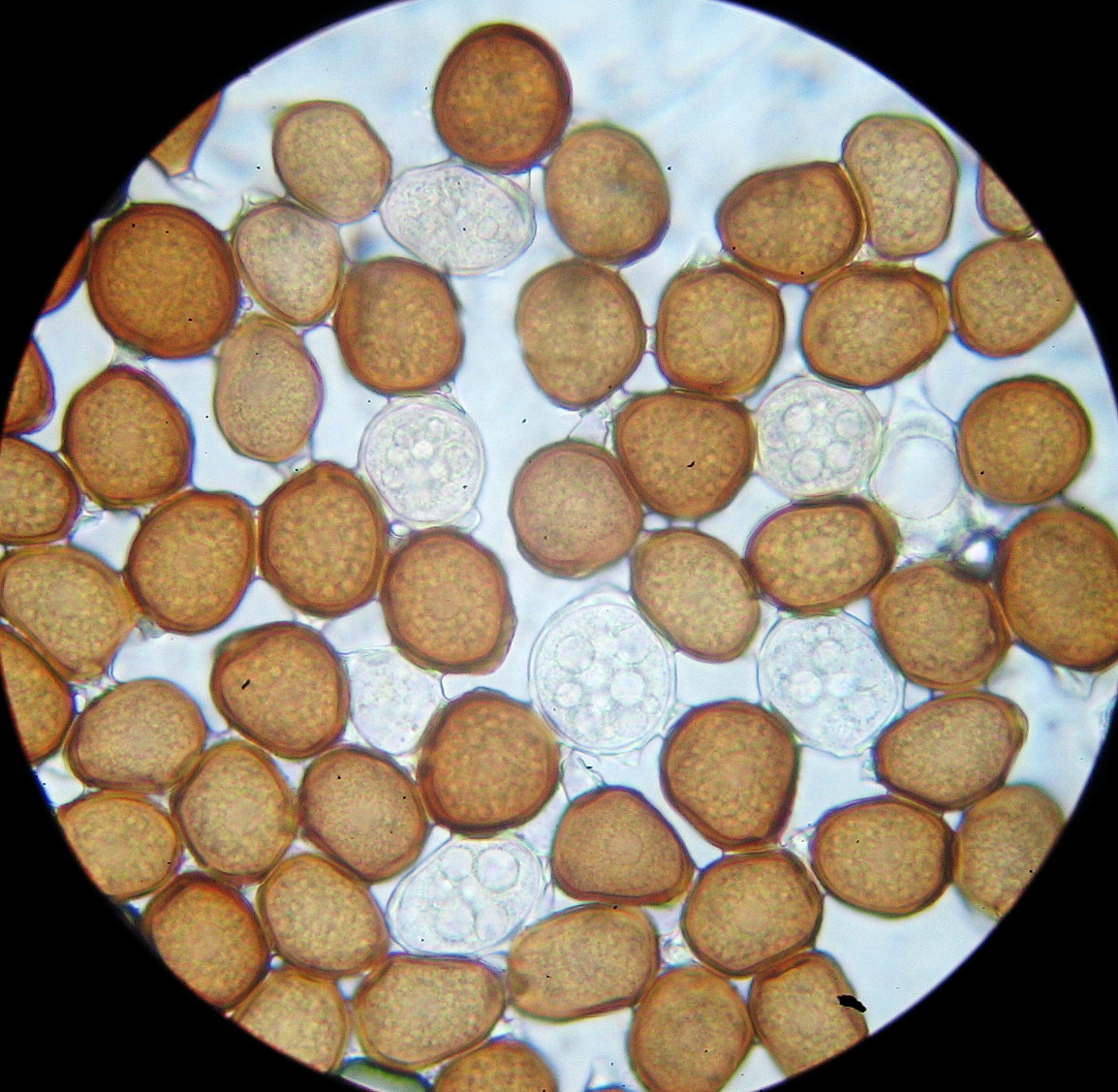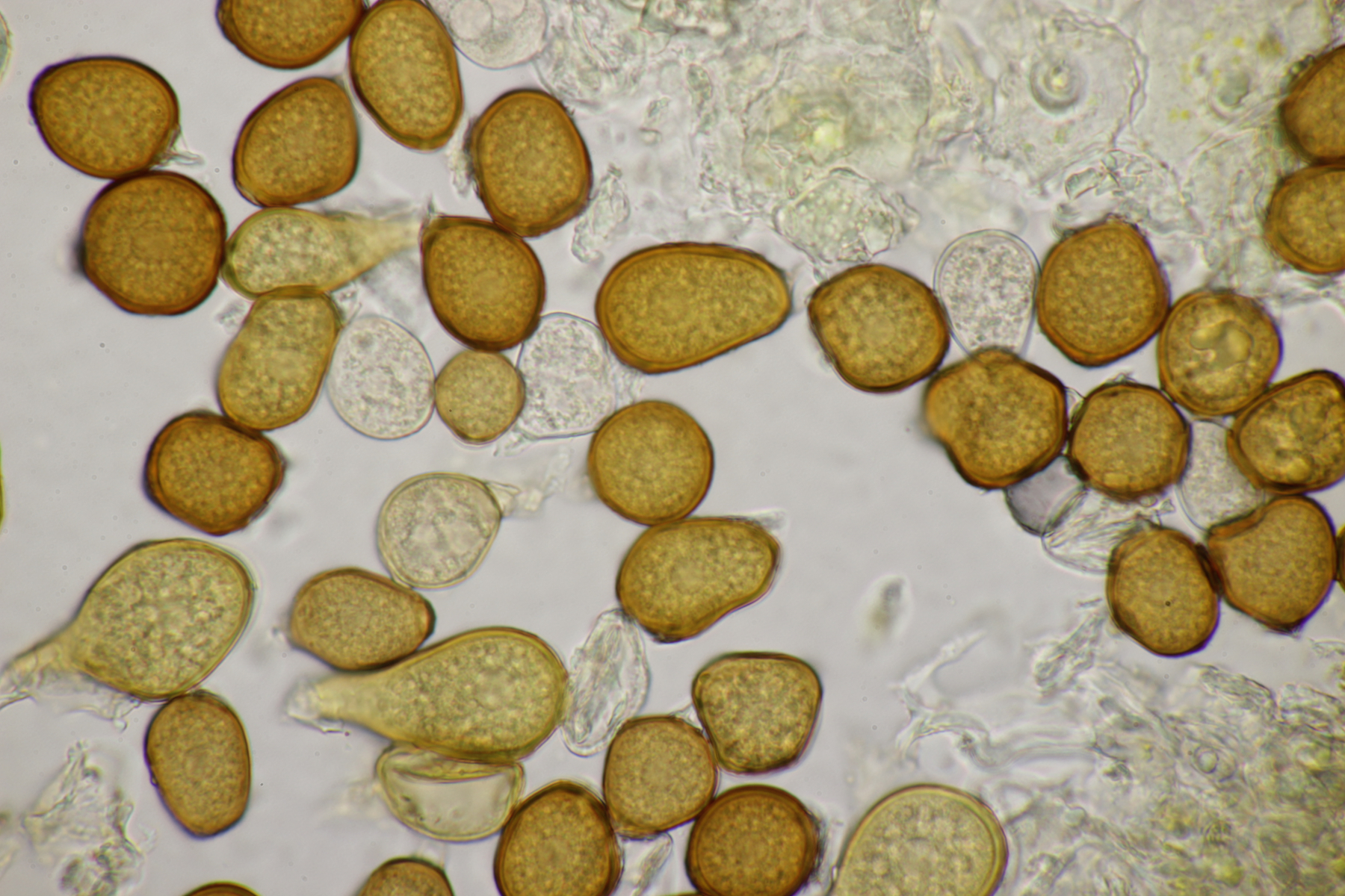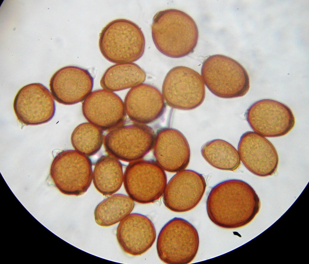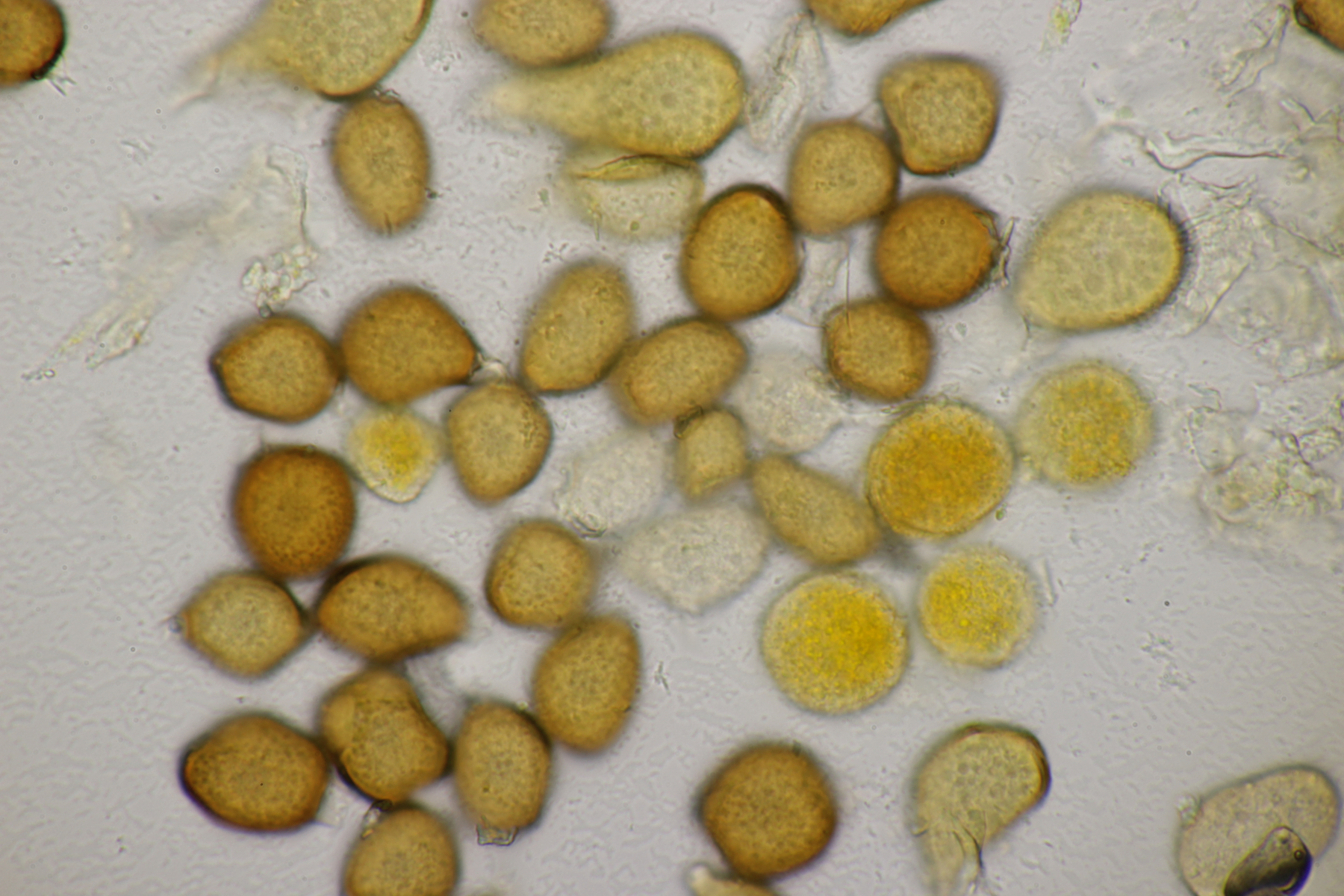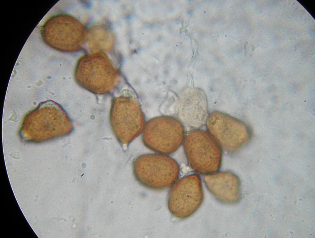 die dann zu braunen Punkten mit braunen, feinrau-warzigen Sporen werden.