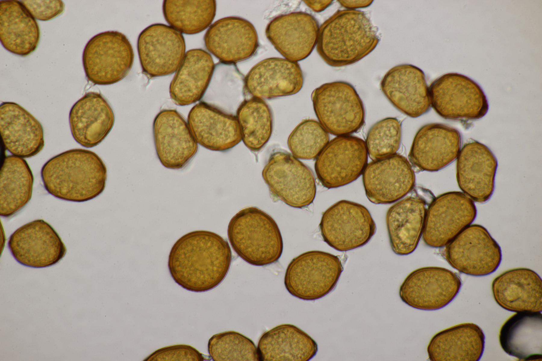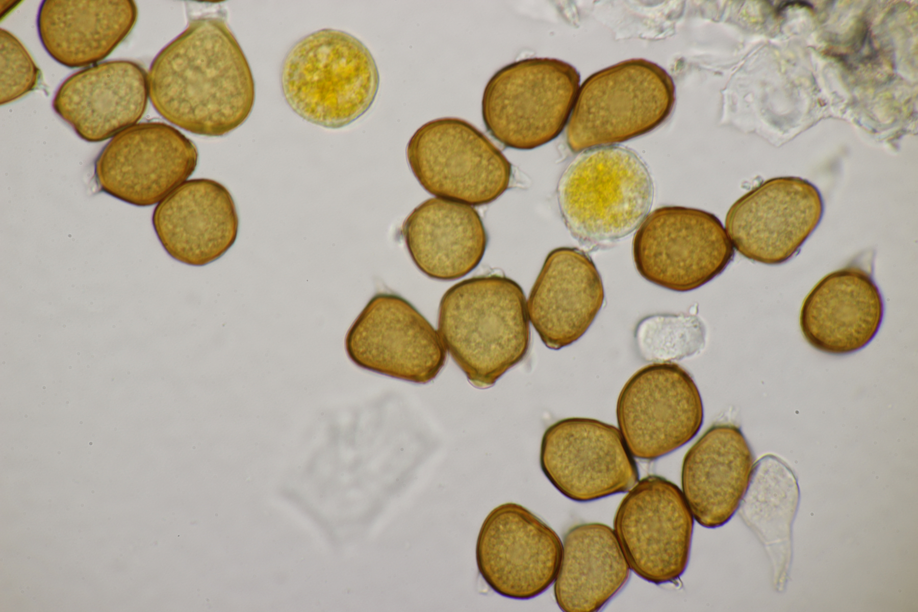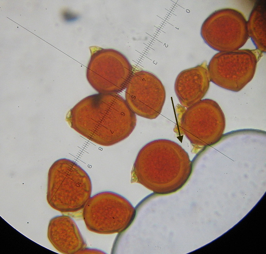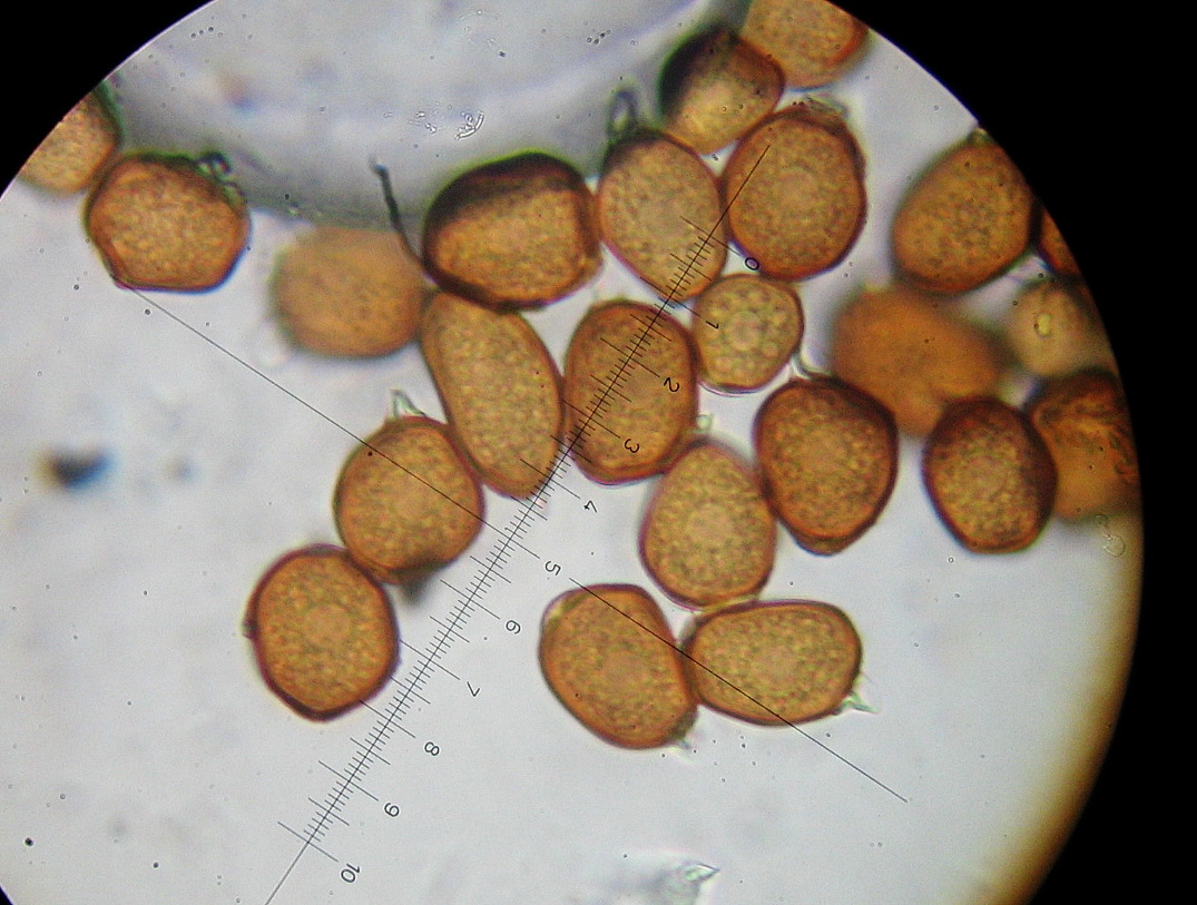 die dann zu braunen Punkten mit braunen, feinrau-warzigen Sporen werden.