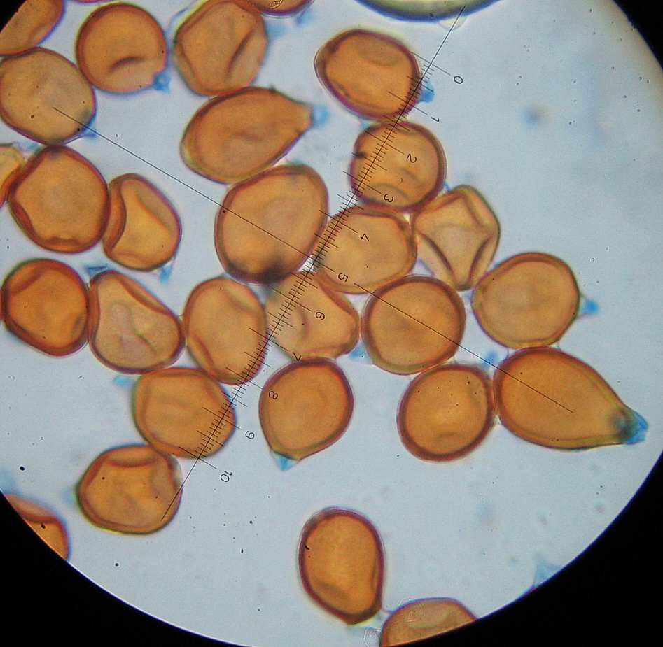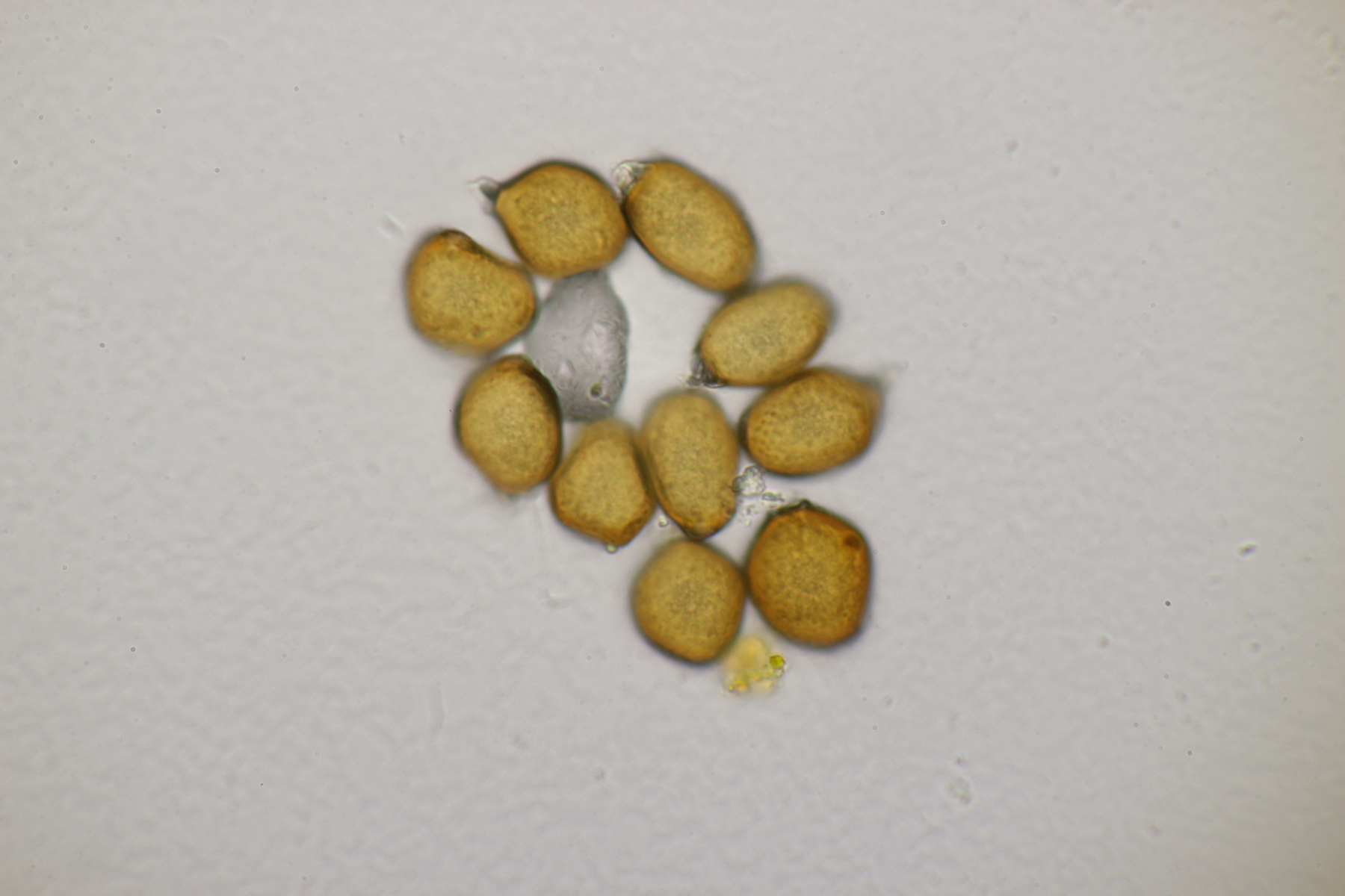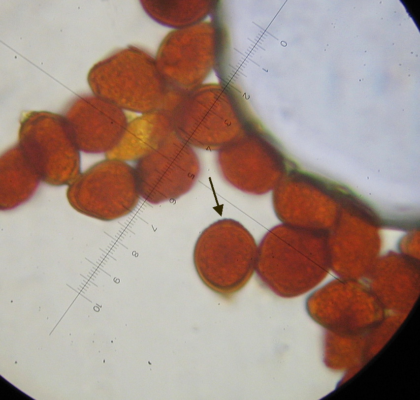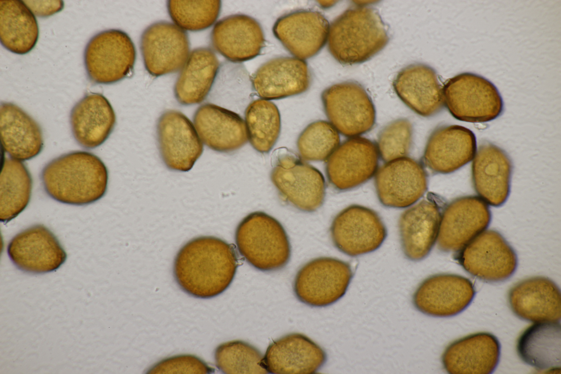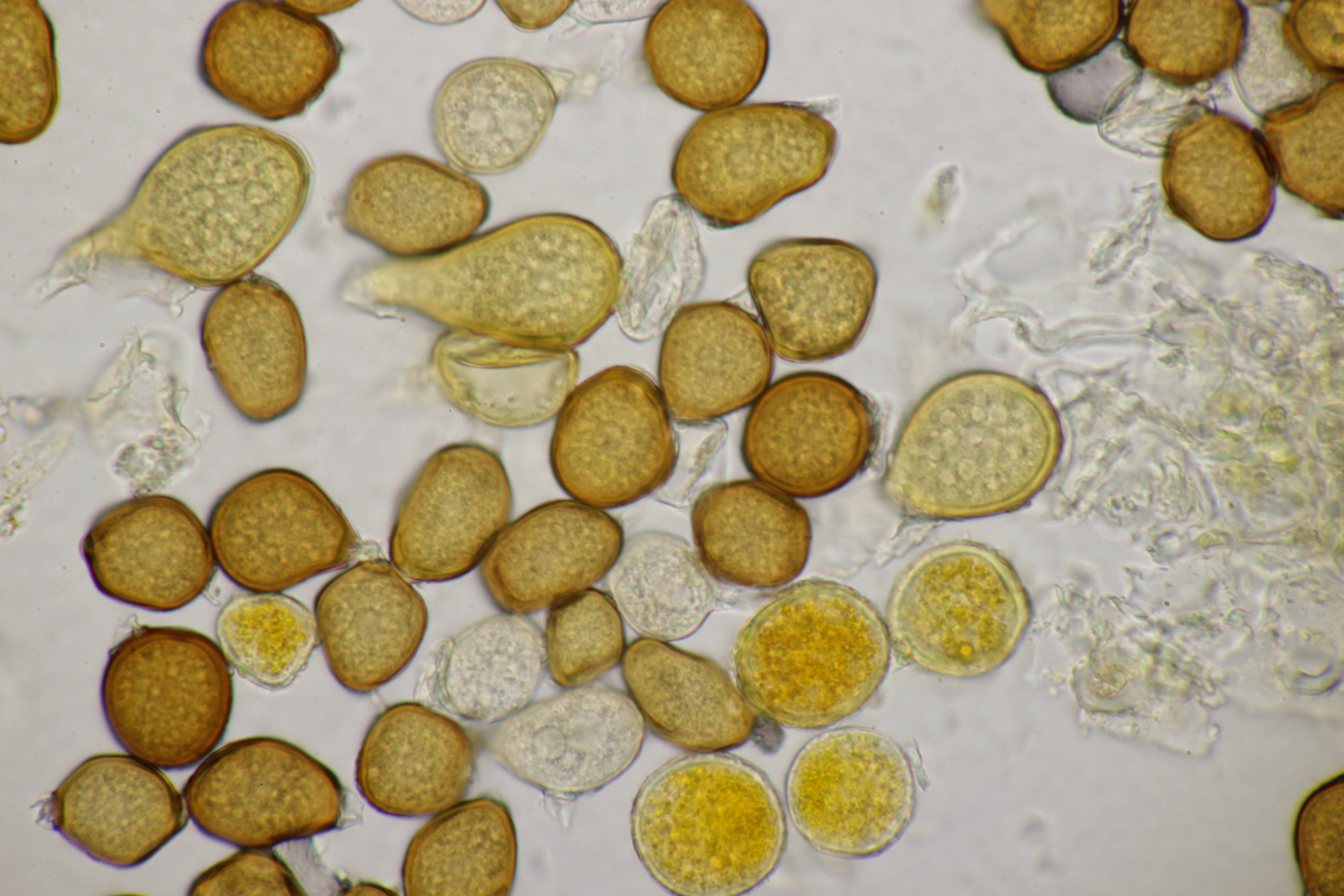 die dann zu braunen Punkten mit braunen, feinrau-warzigen Sporen werden.