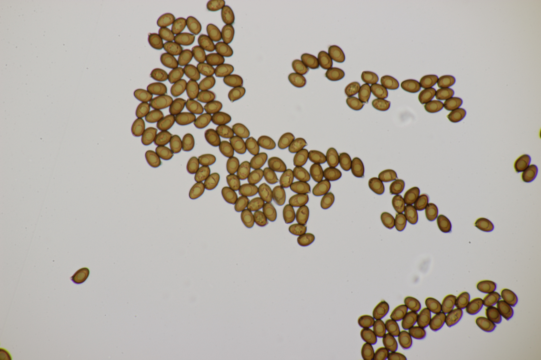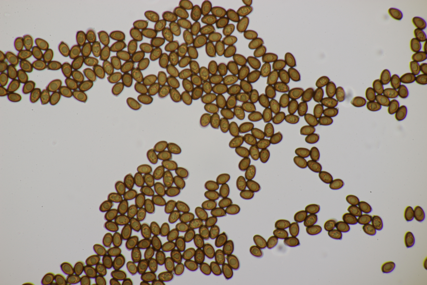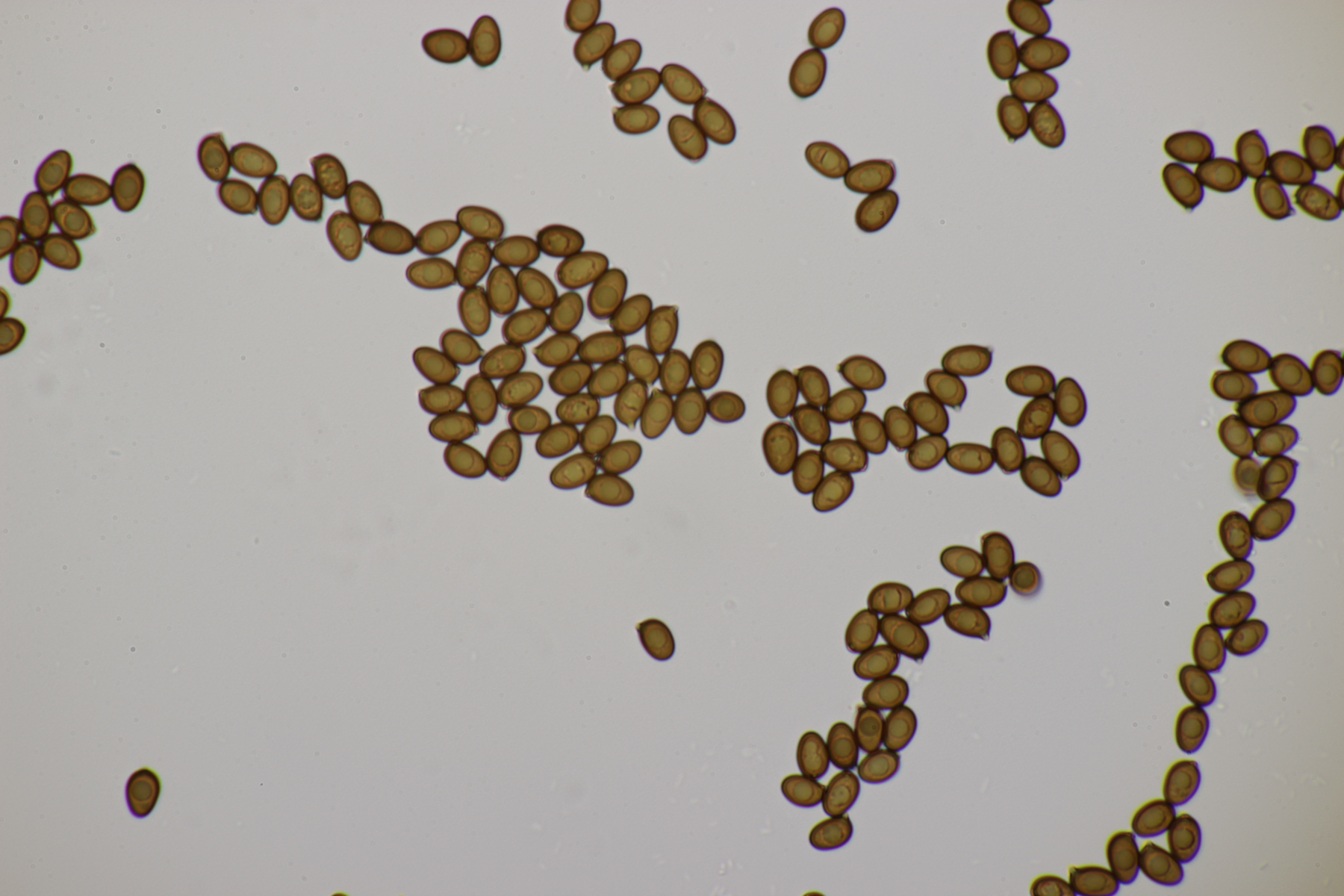 Geruch teilweise eine leichte Marzipannote, besonders beim Anschneiden, ansonsten aber eher leicht unangenehm. Stiel und Hutfleisch zeigen keine Reaktion mit KOH. Sporengröße (7.9+-0.6) µm x (4.9+-0.2) µm, Q=1.6+-0.1. Hat da jemand eine Idee?
