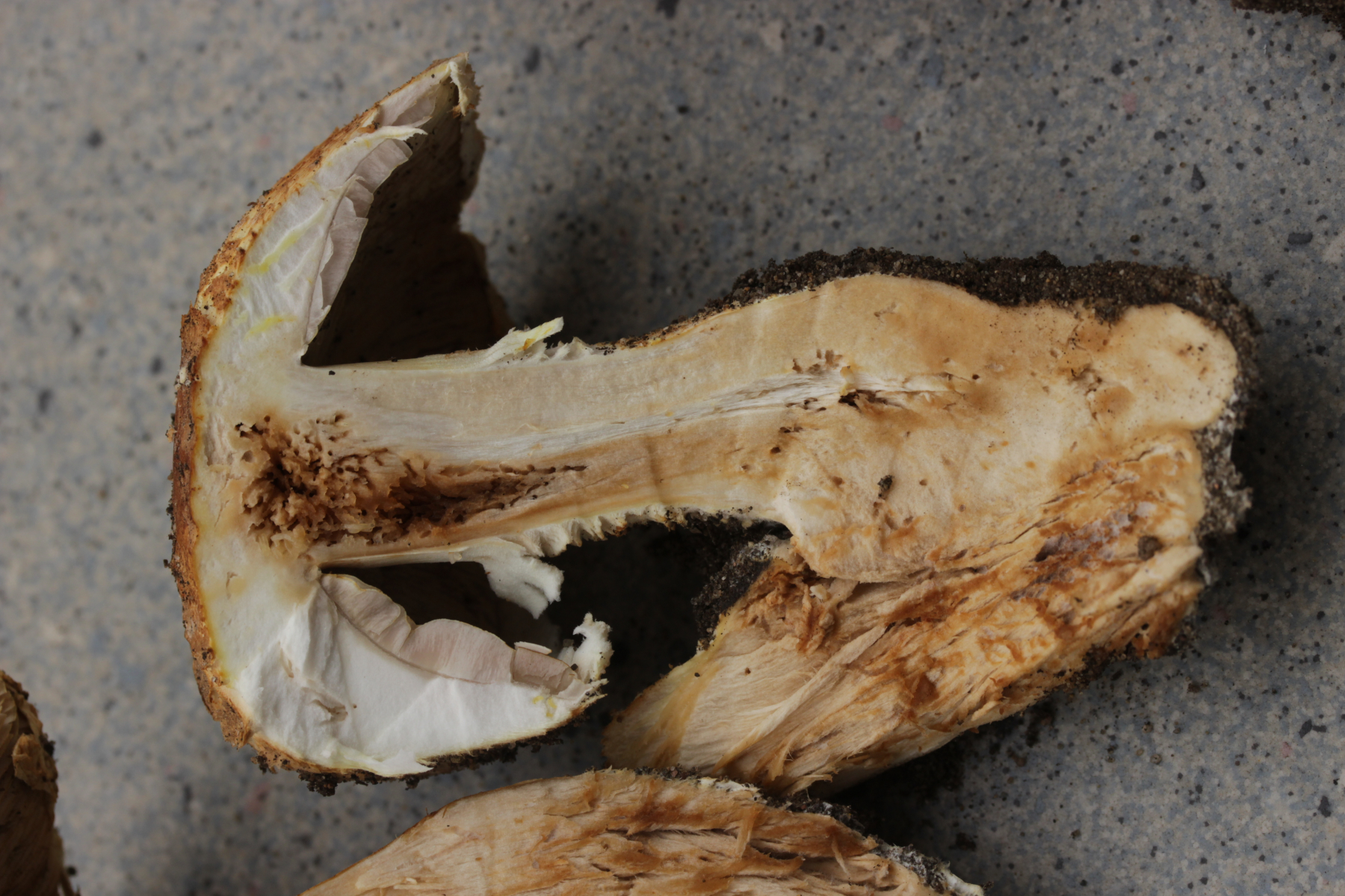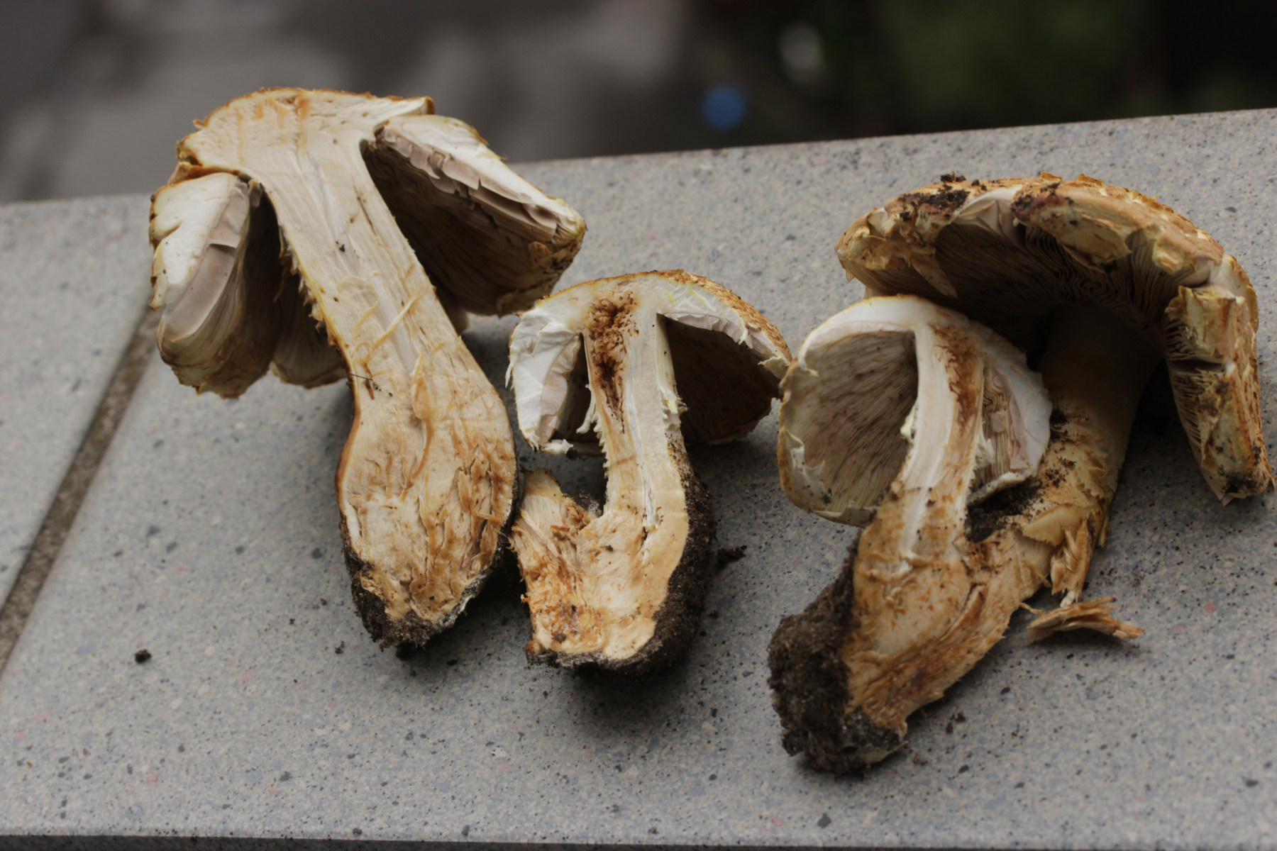als ich gestern ins Büro gegangen bin, stand neben einem Straßenbaum auf nackter Erde eine Gruppe aus vier recht kräftig wirkenden Pilzen. Da ich keine Kamera dabei hatte, habe ich mir dann mal zwei Fruchtkörper mit nach Hause genommen. Insbesondere der größere der beiden Fruchtkörper scheint einen Trockenschaden zu haben, aber bis zu Agaricus komme ich trotzdem. Dann wird es aber schwer.