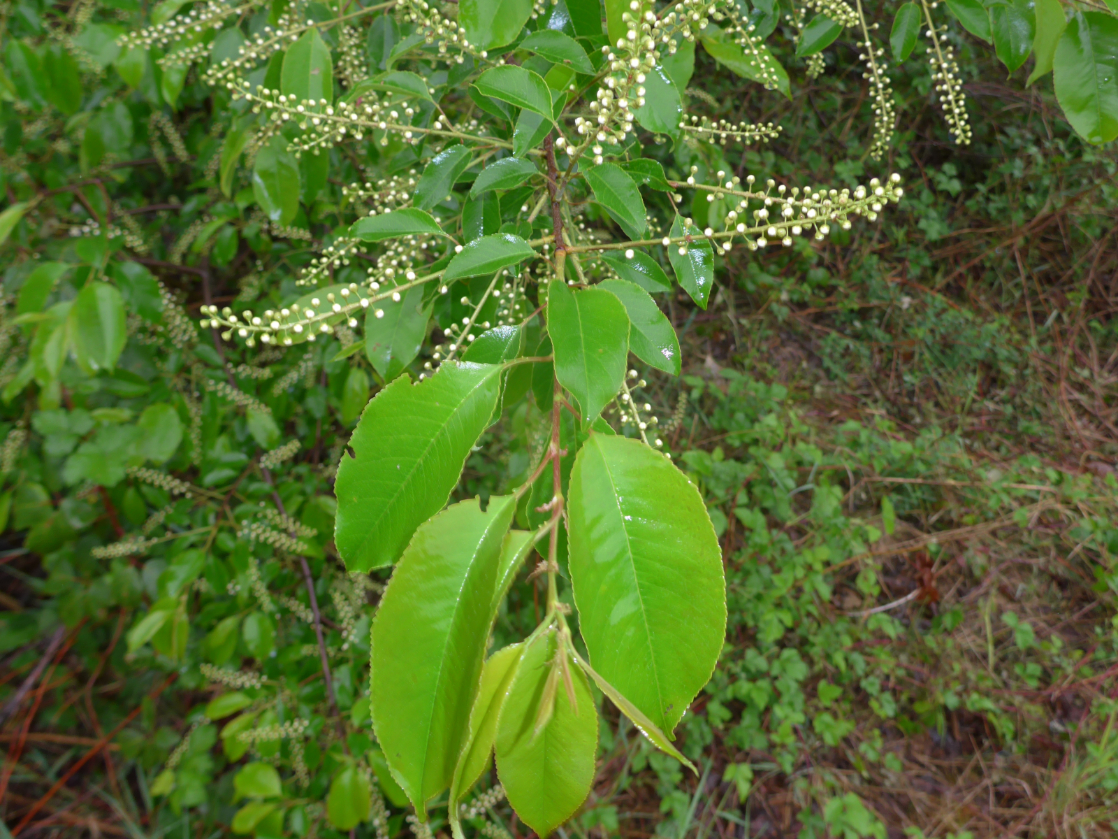 Prunus serotina hingegen hat fast glatte Blätter (Blattnerven fast nicht eingesenkt), glänzende Blätter mit deutlicher Wachsschicht. Fotos von heute; "leider" sind die Blätter nass. Bilder von trockenen ergänze ich gerne.