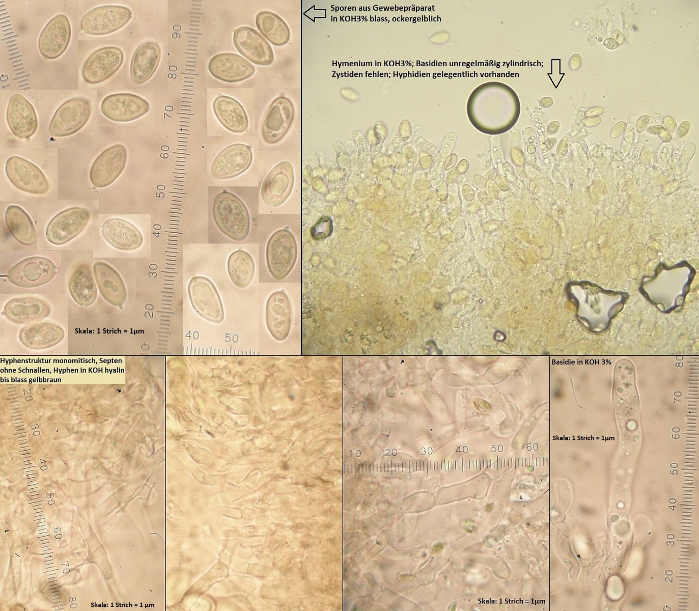 Dann wurde der Pilz beim Trocknen braun, und beim Blick auf die Sporen war's dann klar. Und damit steht man wieder vor diesem Problem, daß mir die Trennung von Coniophora arida und Coniophora puteana anhand von Sporengrößen und Dextrinoidität irgendwie komisch erscheint - weil beide da stark zu variieren scheinen (vor allem dextrinoidität), und die Farbe sowie Größe der Sporen in KOH auch lustig variiert, vor allem je nach Alter der Fruchtkörper. Kein Wunder, sind ja Boletales. Die Sporen von jungen Netzhexen (nur so als Beispiel) sehen auch ganz anders aus als die von alten, wabbeligen und richtig reifen Fruchtkörpern.