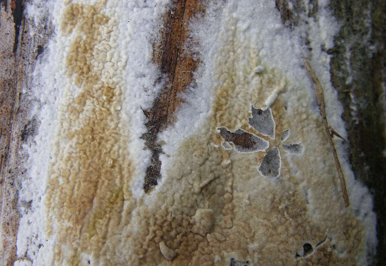 Die Haptik im Frischzustand war schon wachsig, und weil der Fruchtkörper nur an wenigen Stellen schon ein paar reife Sporen produzierte, insgesamt so hell, daß ich gar nicht an Coniophora dachte. Kam mir eher so vor, wie Phlebiella vaga - von der Konsistenz her, und wegen den Rhizomorphen und warzigem Hymenophor, Farbe natürlich anders.