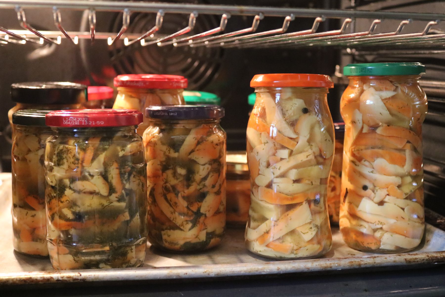 Inzwischen habe ich alle Schraubgläser und Deckel gewaschen und sie dann von der Spülmaschine direkt in den Backofen transferiert und dort ca. 15 Minuten lang bei 120 Grad sterilisiert.