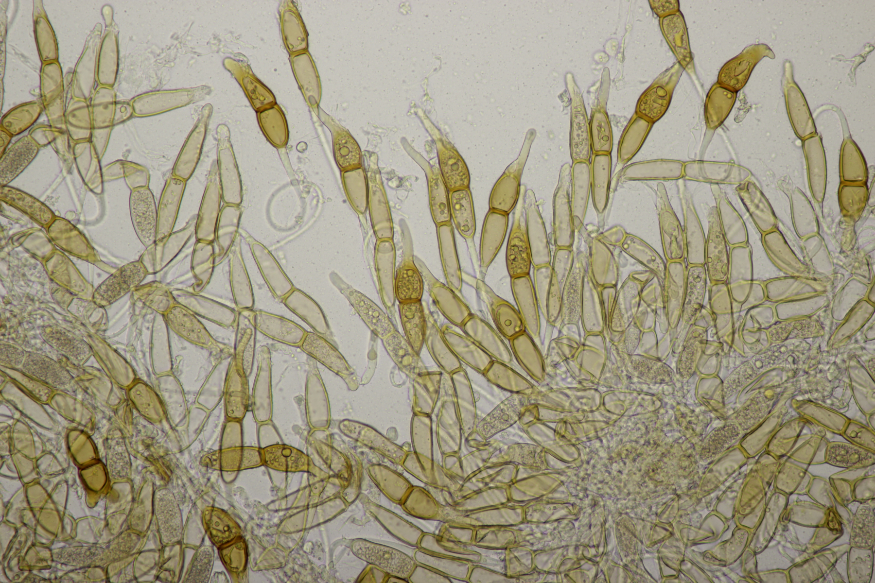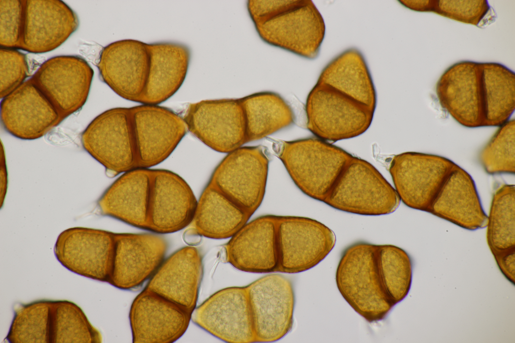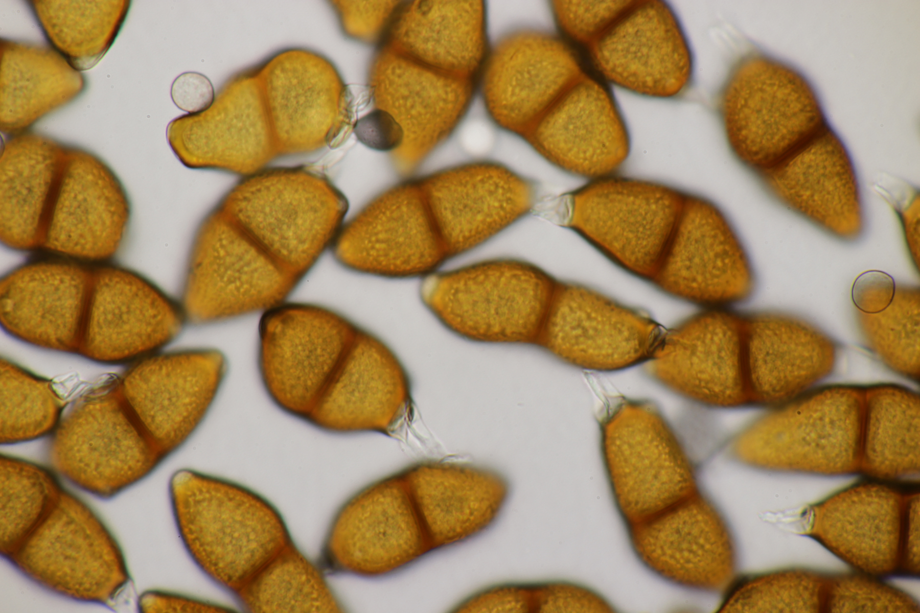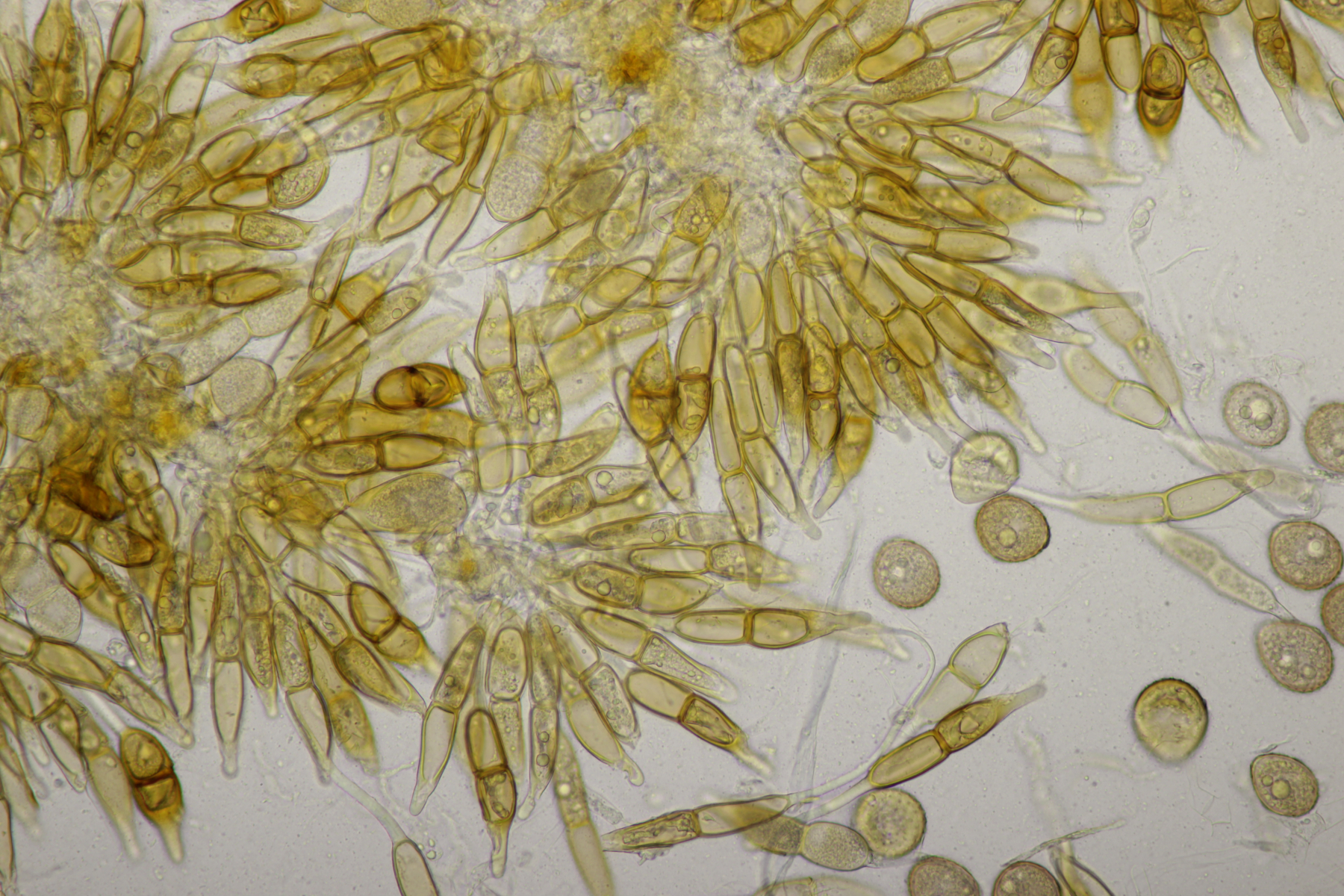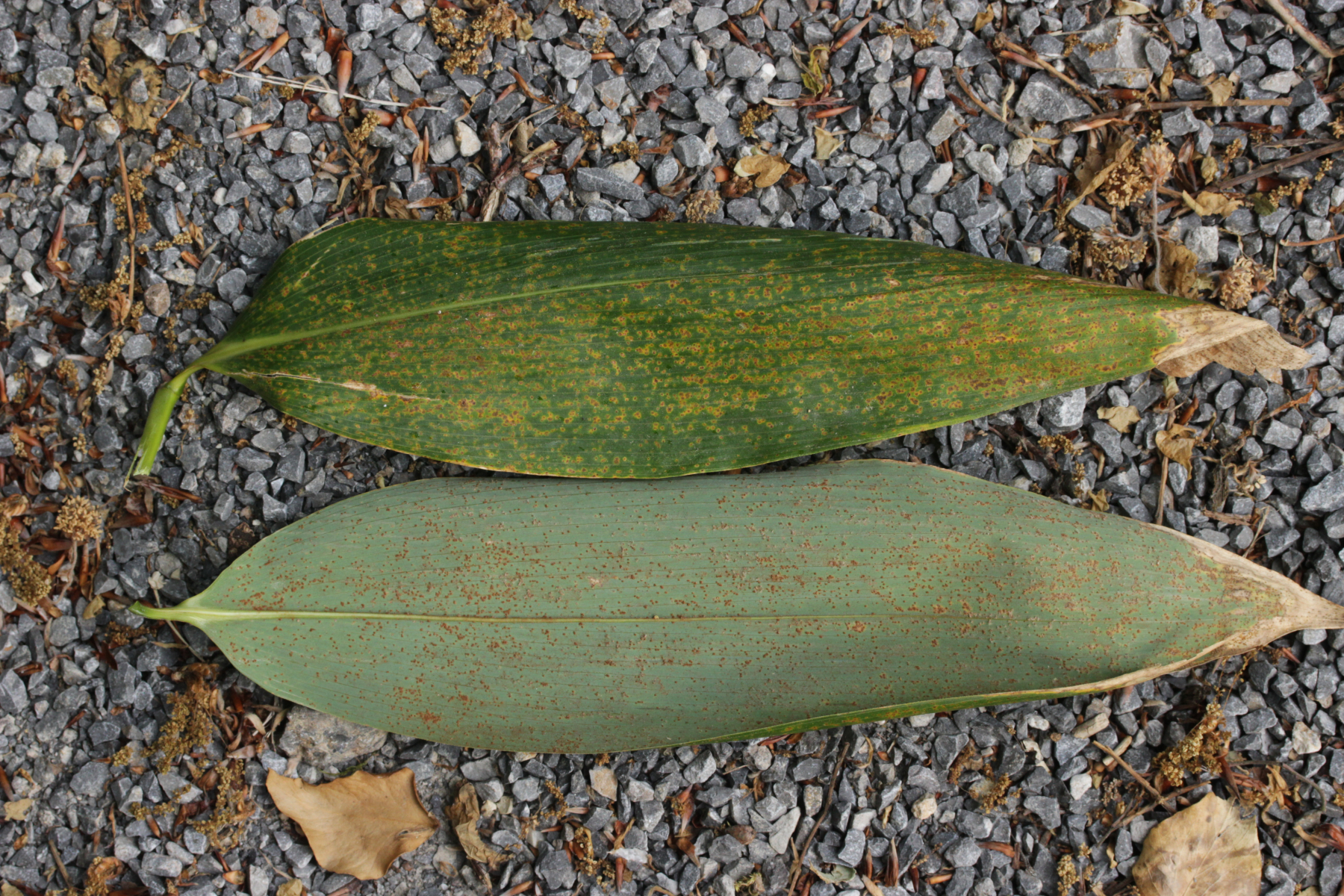 1. Keine Angst, der Klimawandel hat den Duisburger Stadtwald noch nicht in einen tropischen Bambuswald umgewandelt. Aber in einem Vorgarten und daraus hinaushängend gab es dann doch einen Bambus, der auch noch mit einem Rost befallen ist. Da es einerseits Uredien gibt und andererseits auch Telien, bei denen die Teliosporen eine ausgeprägte Spitze haben, geht das hier wohl in die Richtung Puccinia sasicola oder Puccinia longicornis.