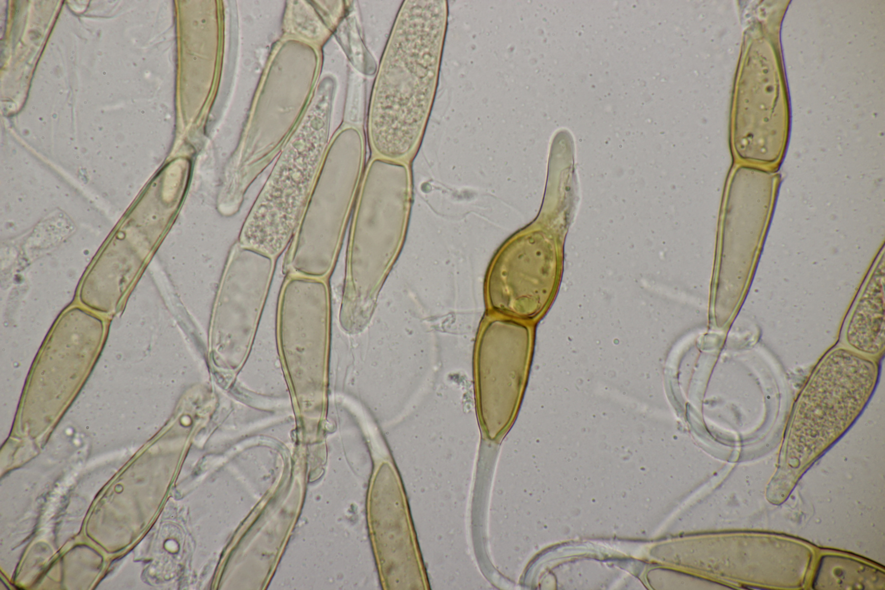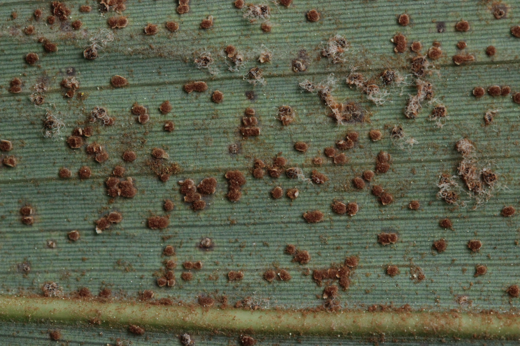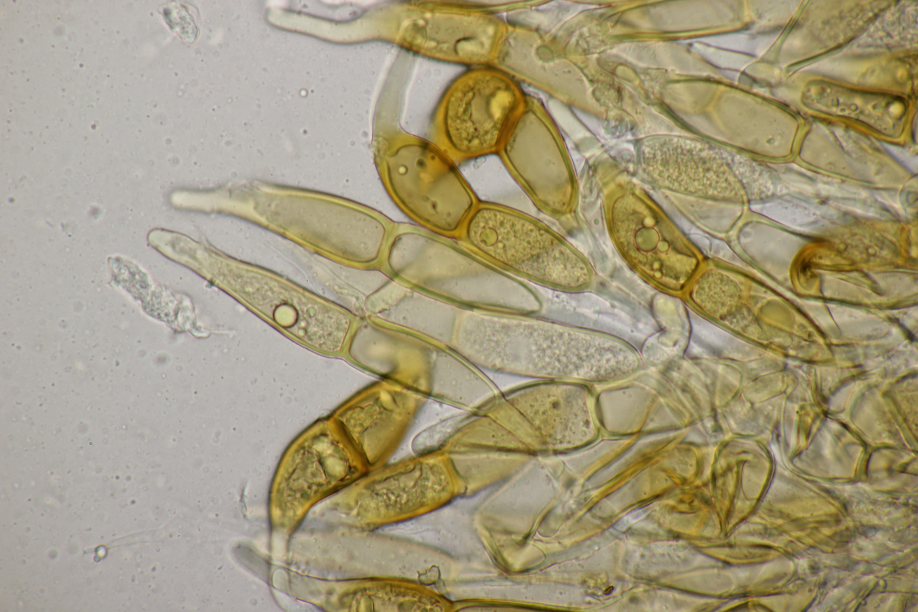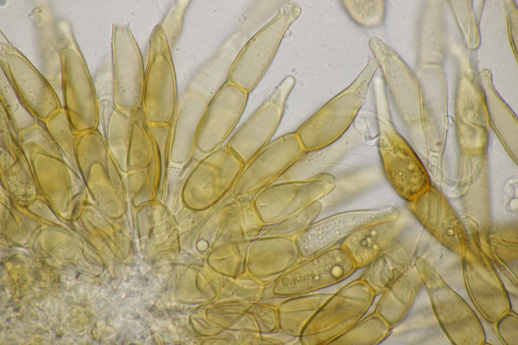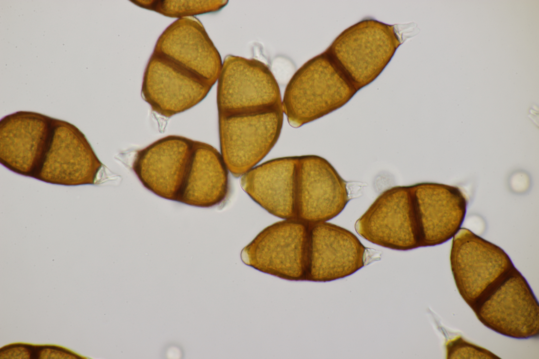 1. Keine Angst, der Klimawandel hat den Duisburger Stadtwald noch nicht in einen tropischen Bambuswald umgewandelt. Aber in einem Vorgarten und daraus hinaushängend gab es dann doch einen Bambus, der auch noch mit einem Rost befallen ist. Da es einerseits Uredien gibt und andererseits auch Telien, bei denen die Teliosporen eine ausgeprägte Spitze haben, geht das hier wohl in die Richtung Puccinia sasicola oder Puccinia longicornis.