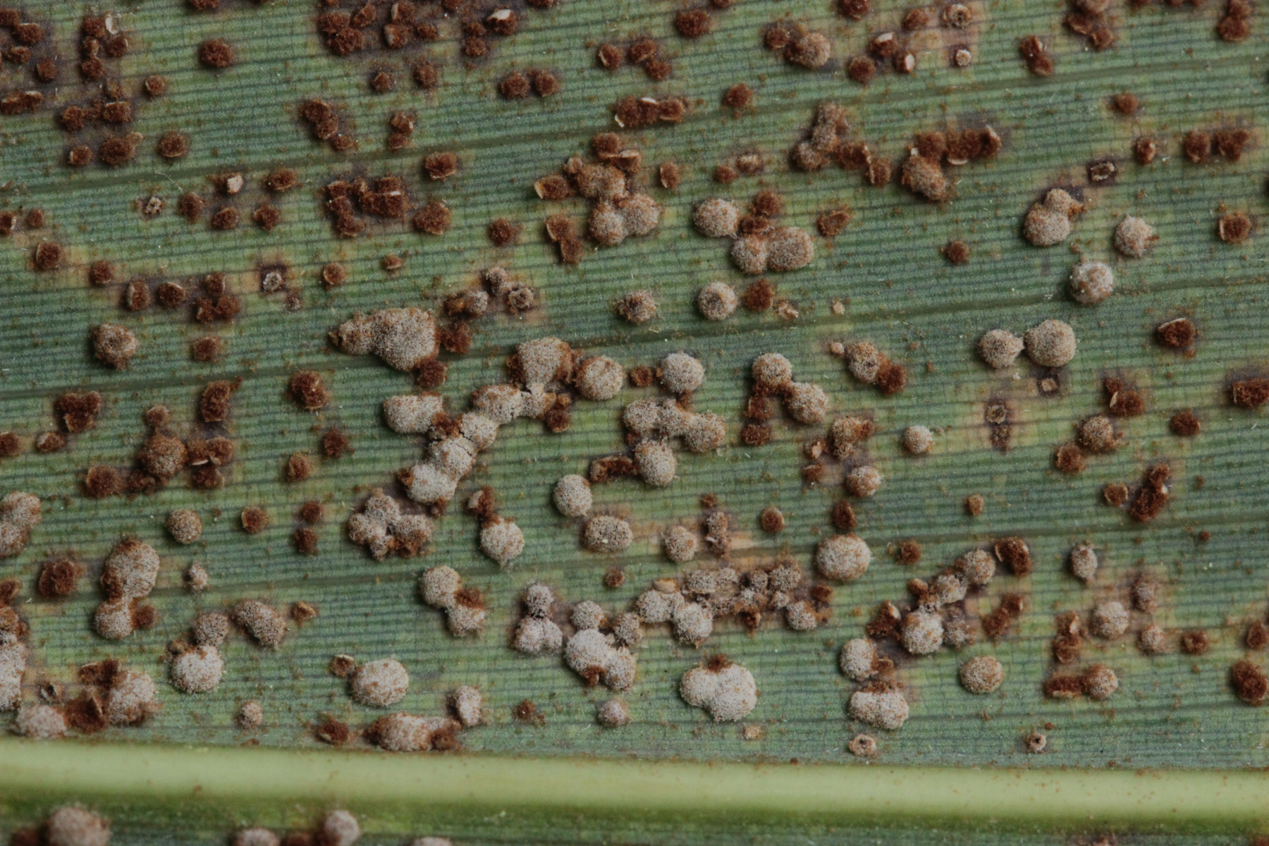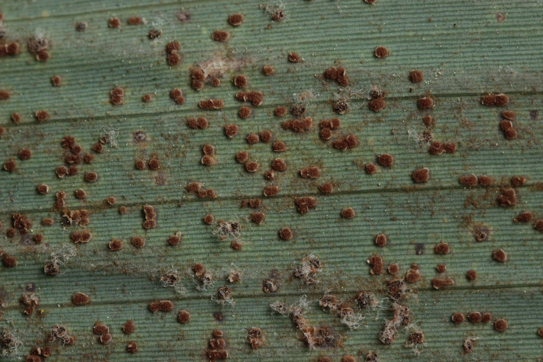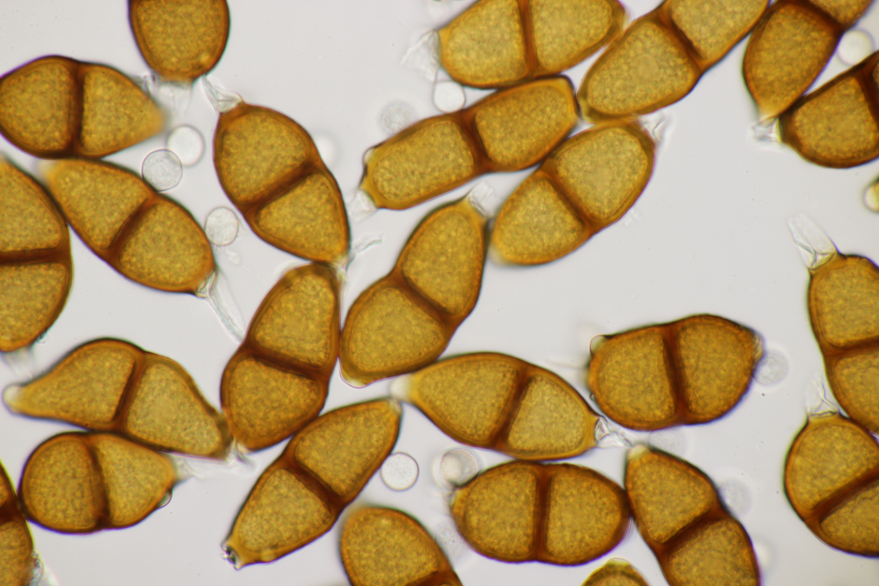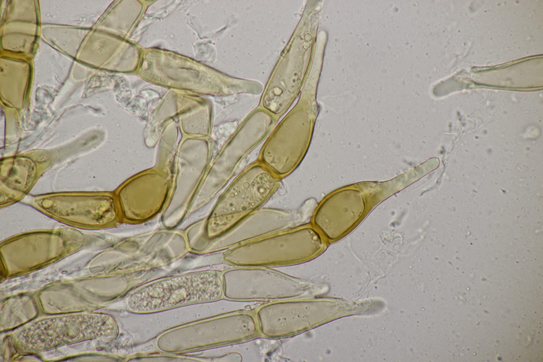 1. Keine Angst, der Klimawandel hat den Duisburger Stadtwald noch nicht in einen tropischen Bambuswald umgewandelt. Aber in einem Vorgarten und daraus hinaushängend gab es dann doch einen Bambus, der auch noch mit einem Rost befallen ist. Da es einerseits Uredien gibt und andererseits auch Telien, bei denen die Teliosporen eine ausgeprägte Spitze haben, geht das hier wohl in die Richtung Puccinia sasicola oder Puccinia longicornis.