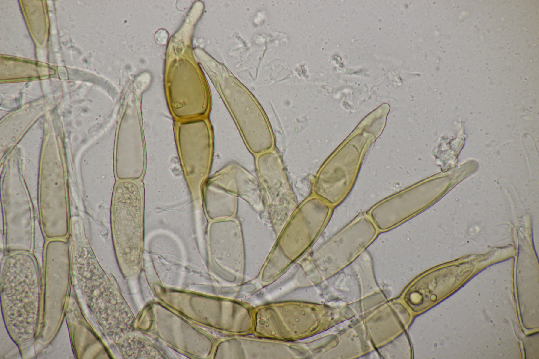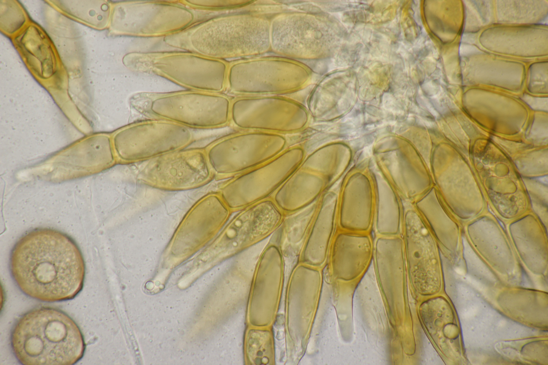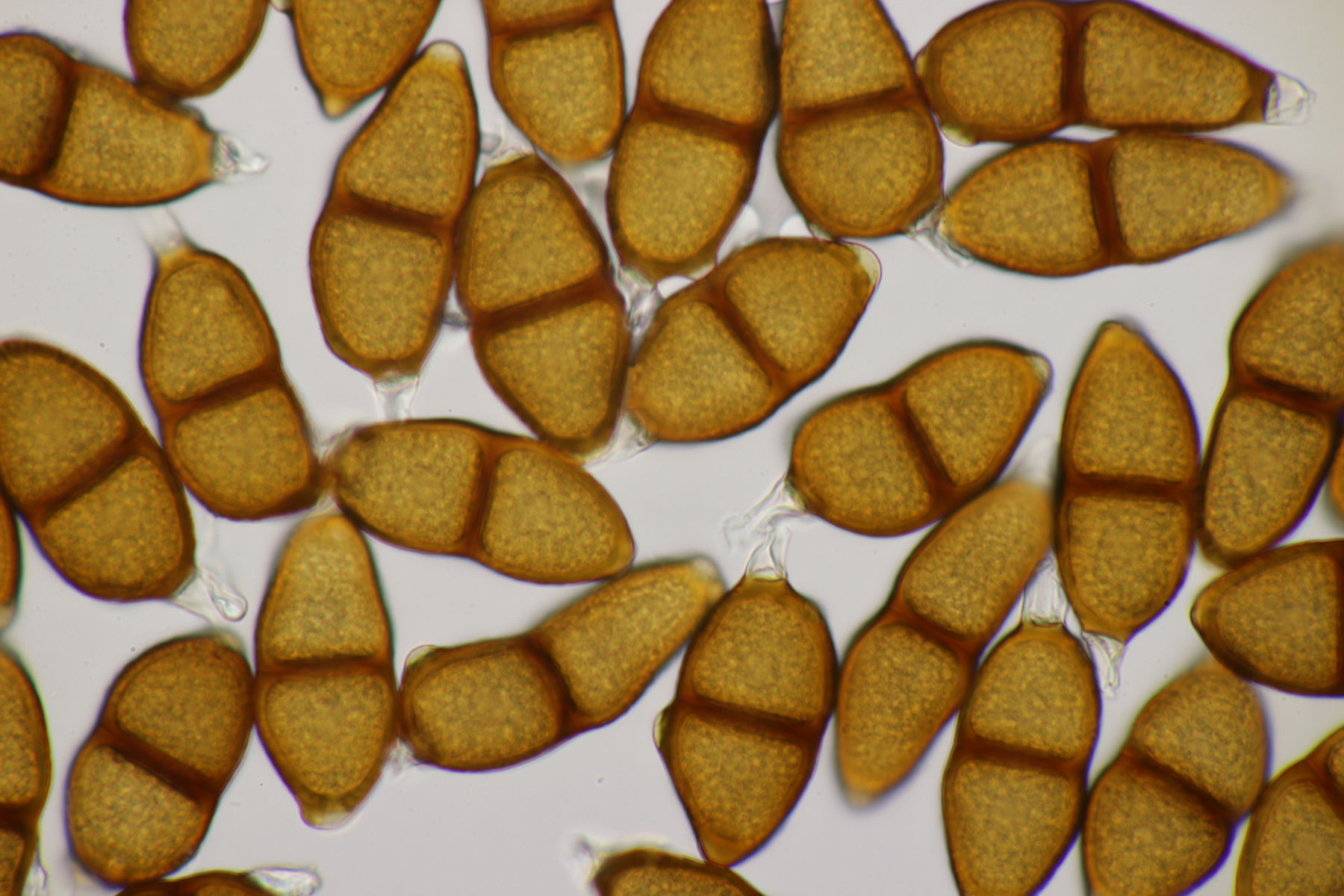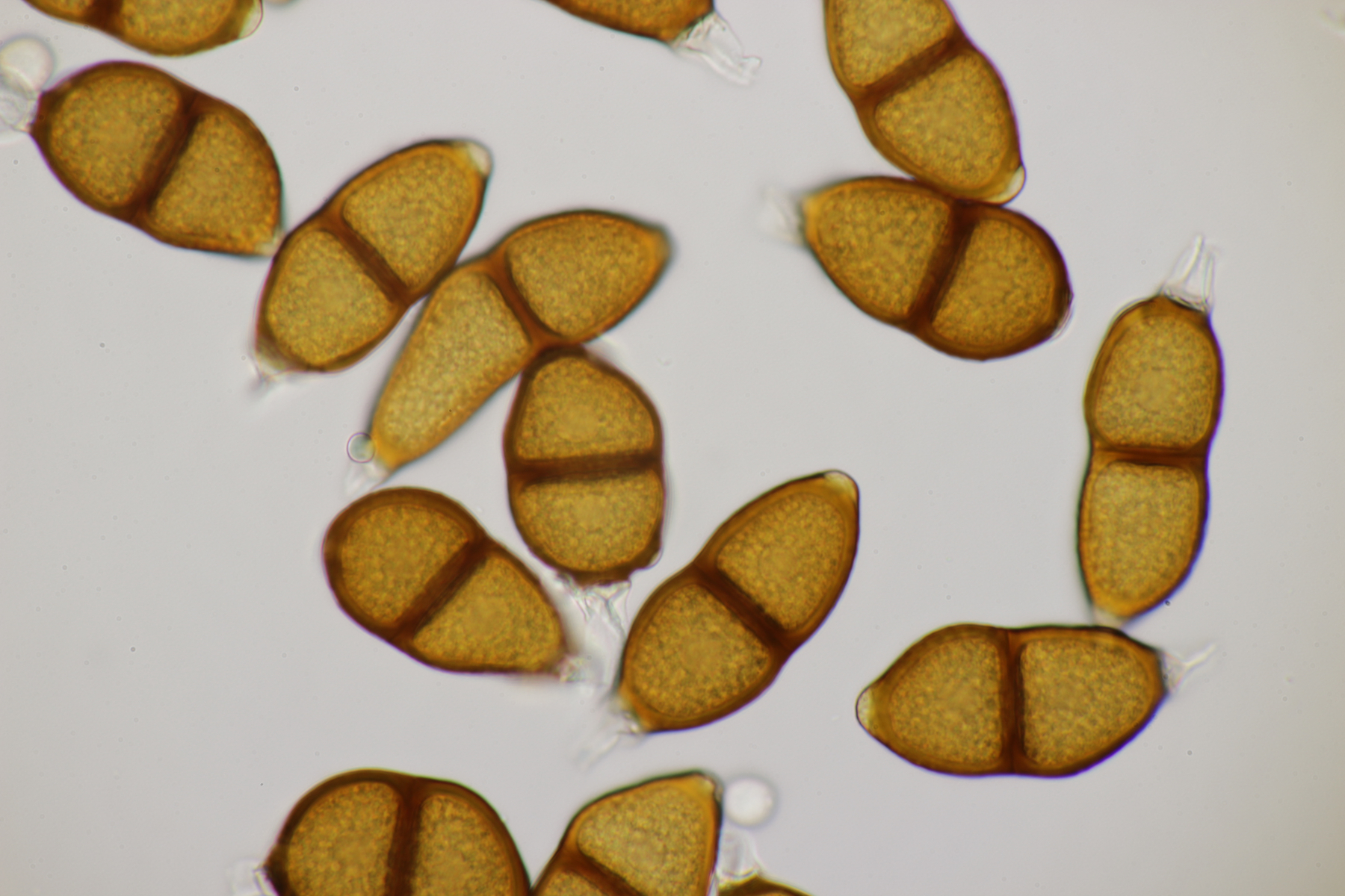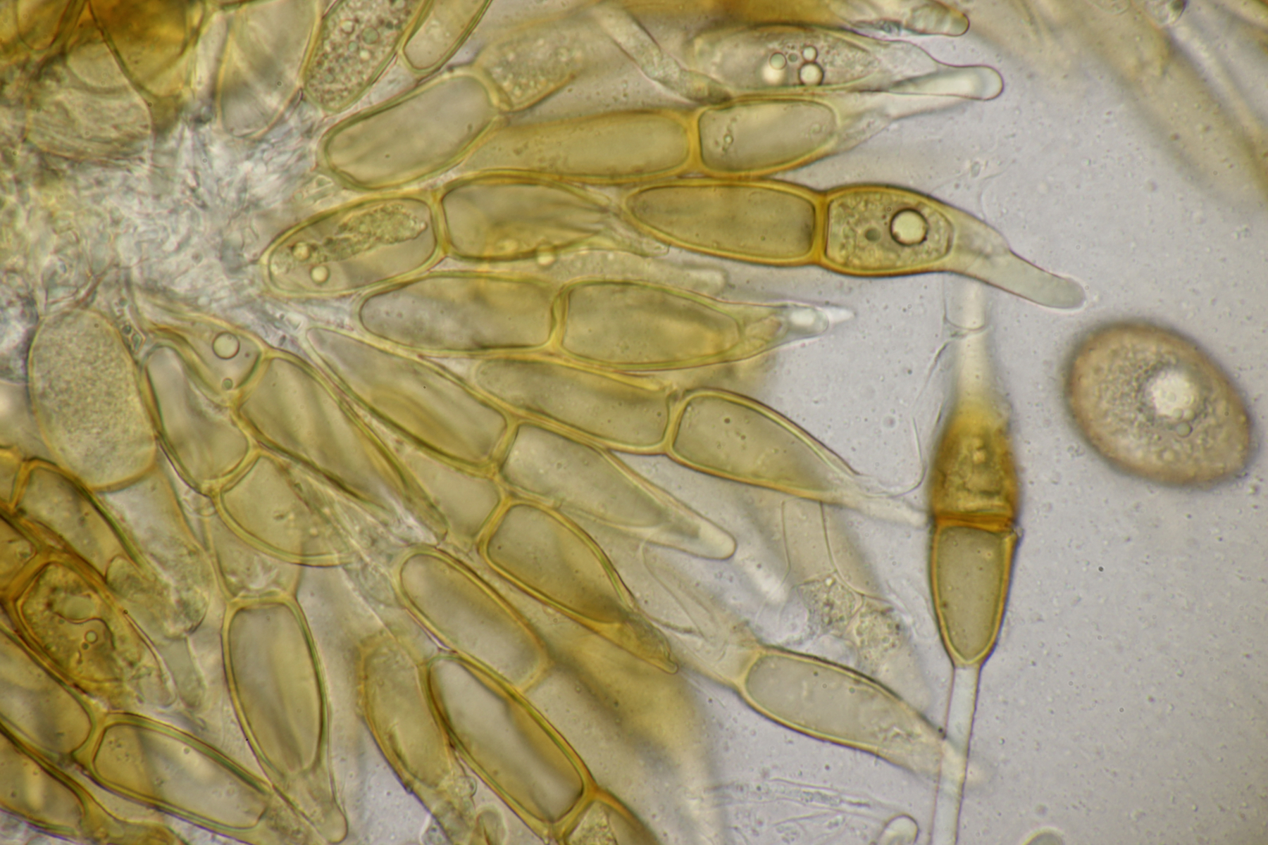 1. Keine Angst, der Klimawandel hat den Duisburger Stadtwald noch nicht in einen tropischen Bambuswald umgewandelt. Aber in einem Vorgarten und daraus hinaushängend gab es dann doch einen Bambus, der auch noch mit einem Rost befallen ist. Da es einerseits Uredien gibt und andererseits auch Telien, bei denen die Teliosporen eine ausgeprägte Spitze haben, geht das hier wohl in die Richtung Puccinia sasicola oder Puccinia longicornis.