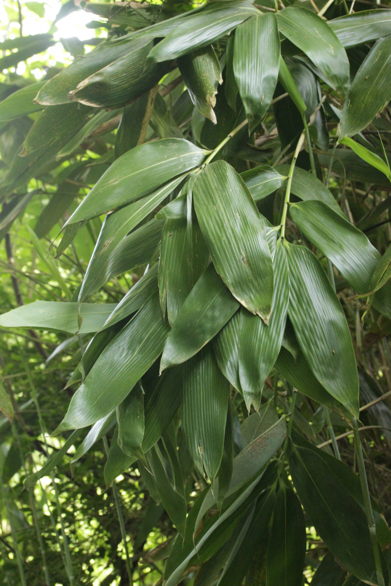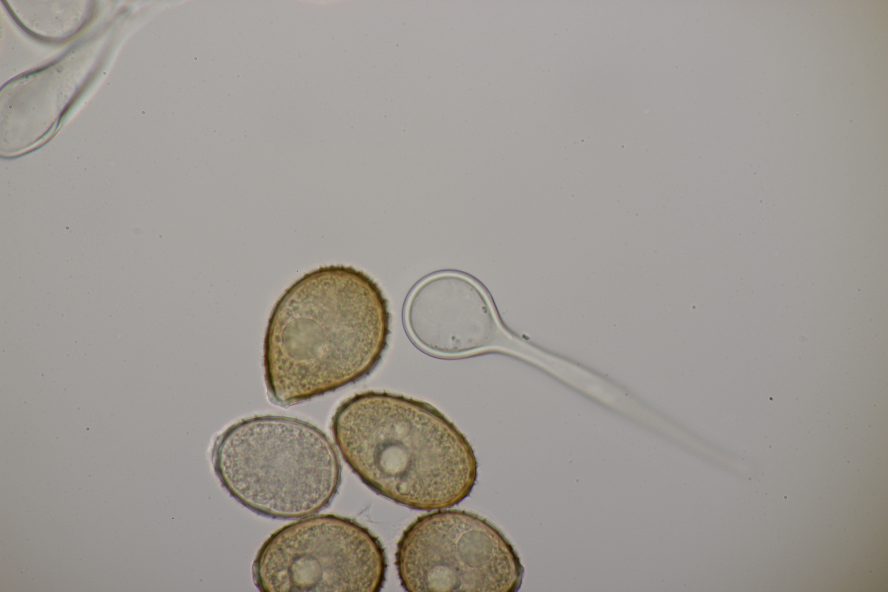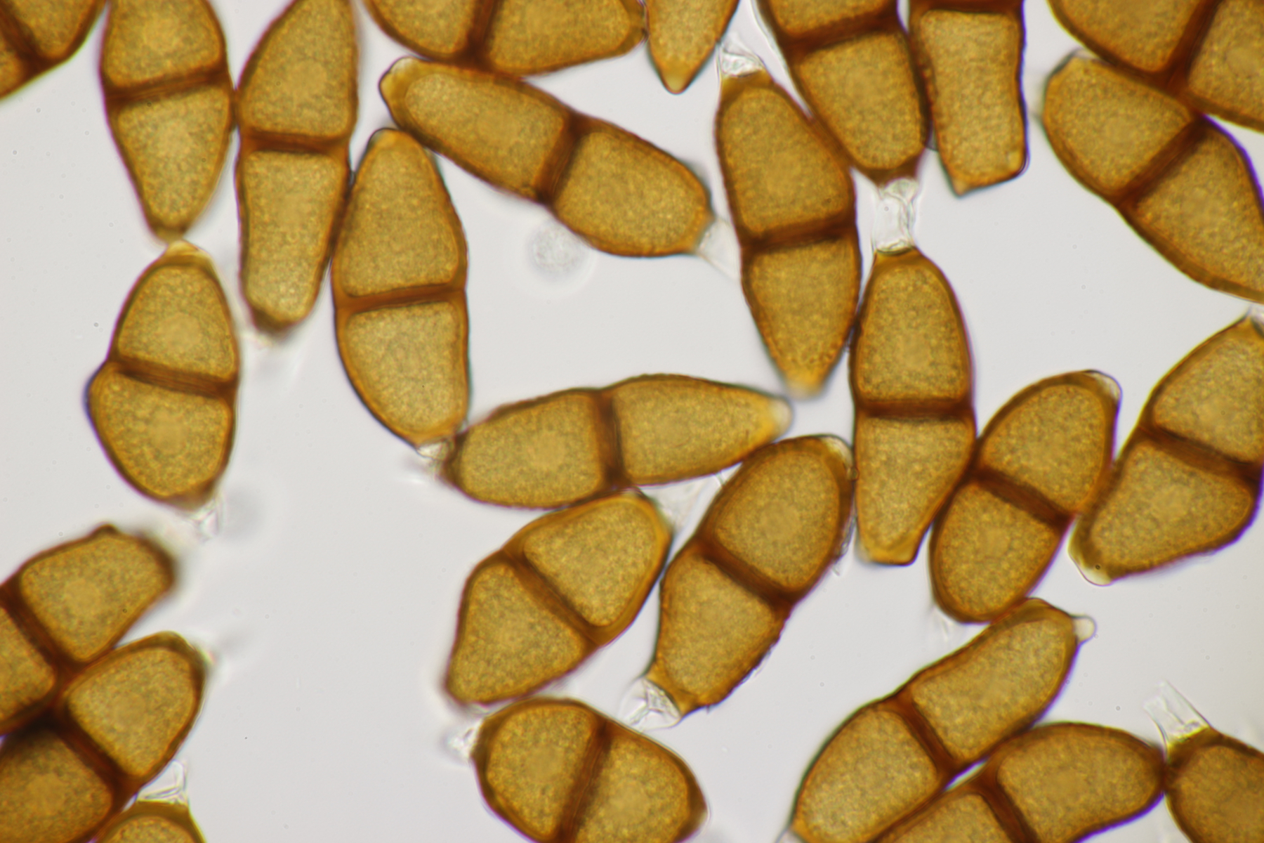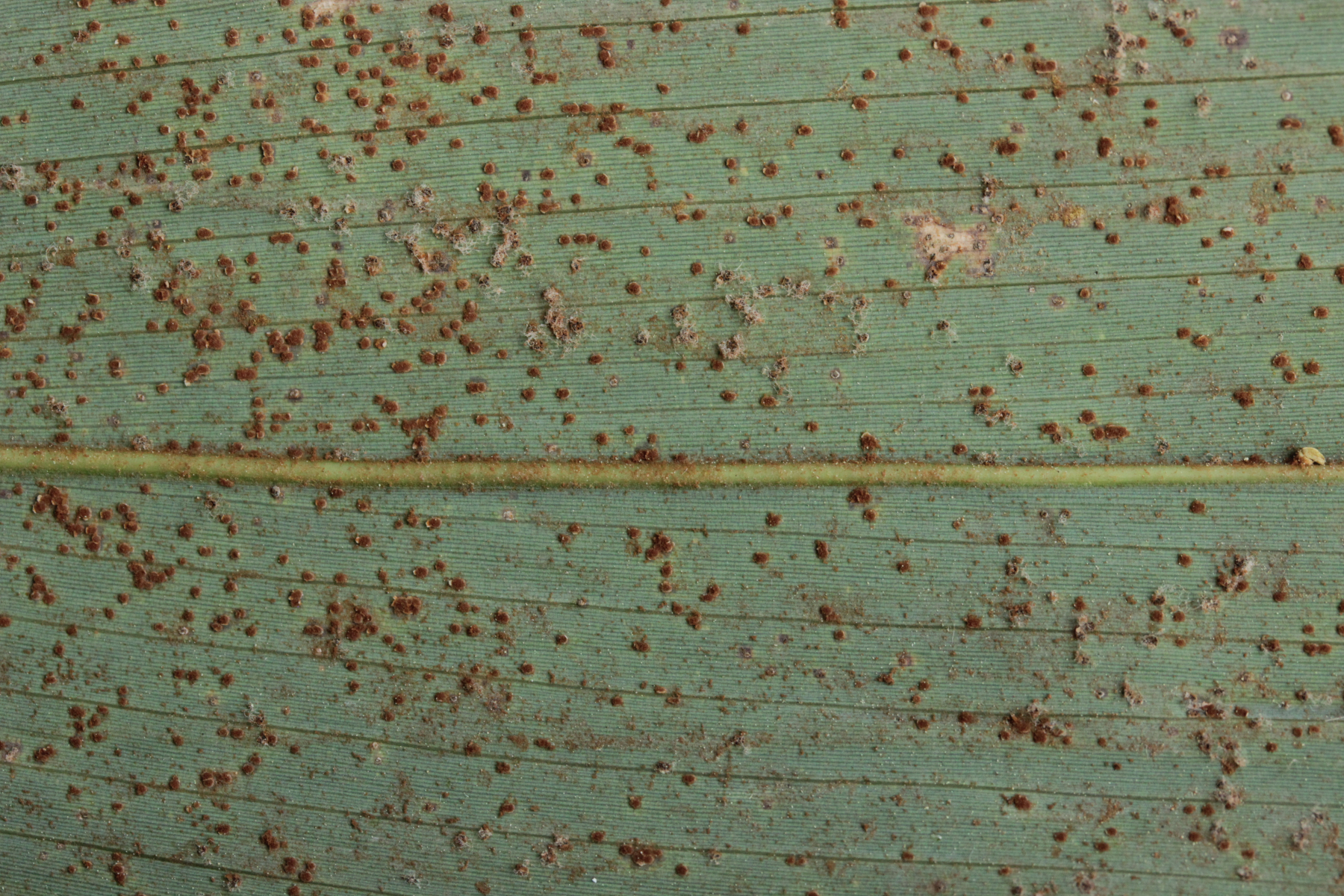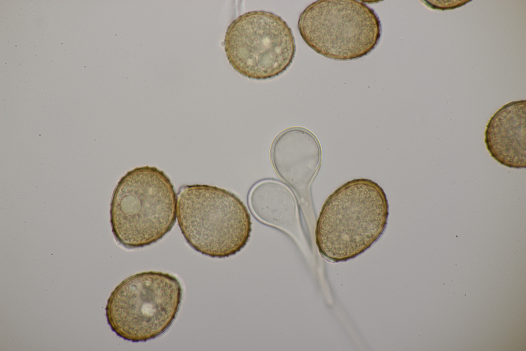 1. Keine Angst, der Klimawandel hat den Duisburger Stadtwald noch nicht in einen tropischen Bambuswald umgewandelt. Aber in einem Vorgarten und daraus hinaushängend gab es dann doch einen Bambus, der auch noch mit einem Rost befallen ist. Da es einerseits Uredien gibt und andererseits auch Telien, bei denen die Teliosporen eine ausgeprägte Spitze haben, geht das hier wohl in die Richtung Puccinia sasicola oder Puccinia longicornis.