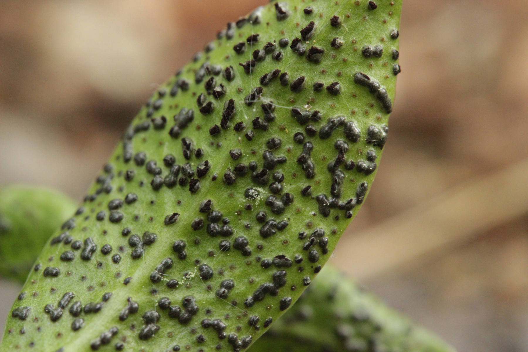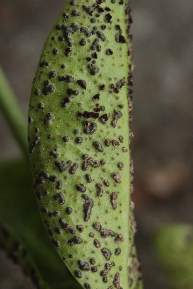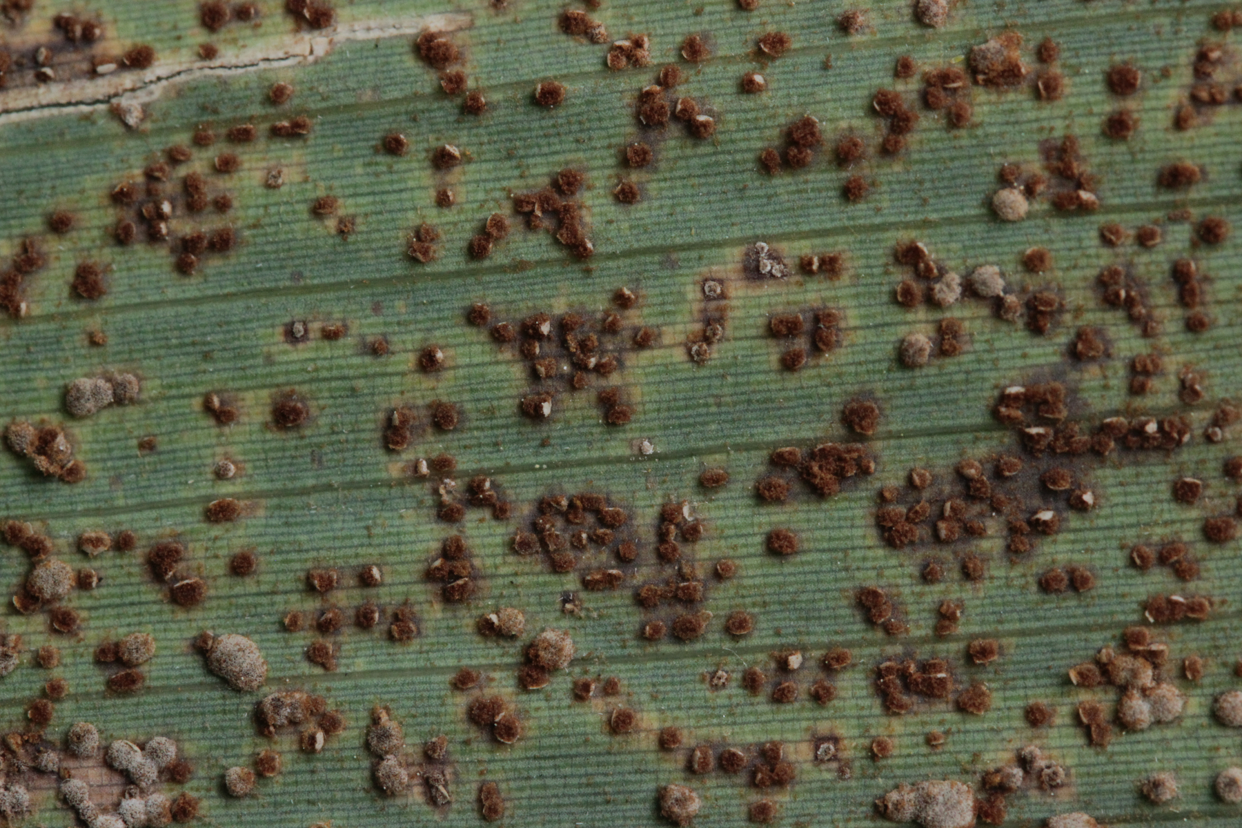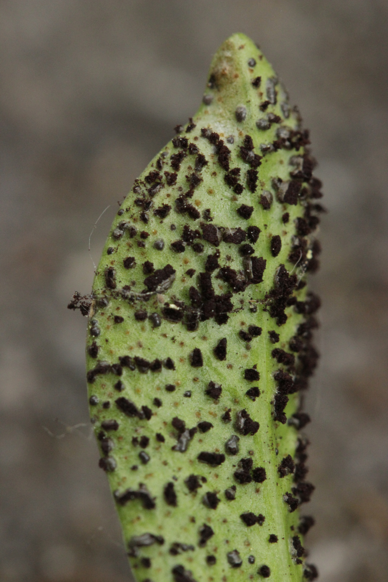 2. Puccinia cribrata ex Vinca minor. Wenn man genau hinschaut, sieht man auch, daß einige Telien leicht violett sind. Das ist ein Befall mit dem Hyperparasiten Tuberculina sbrozzii, der sich mikroskopisch in Form von runden Konidien zeigt.