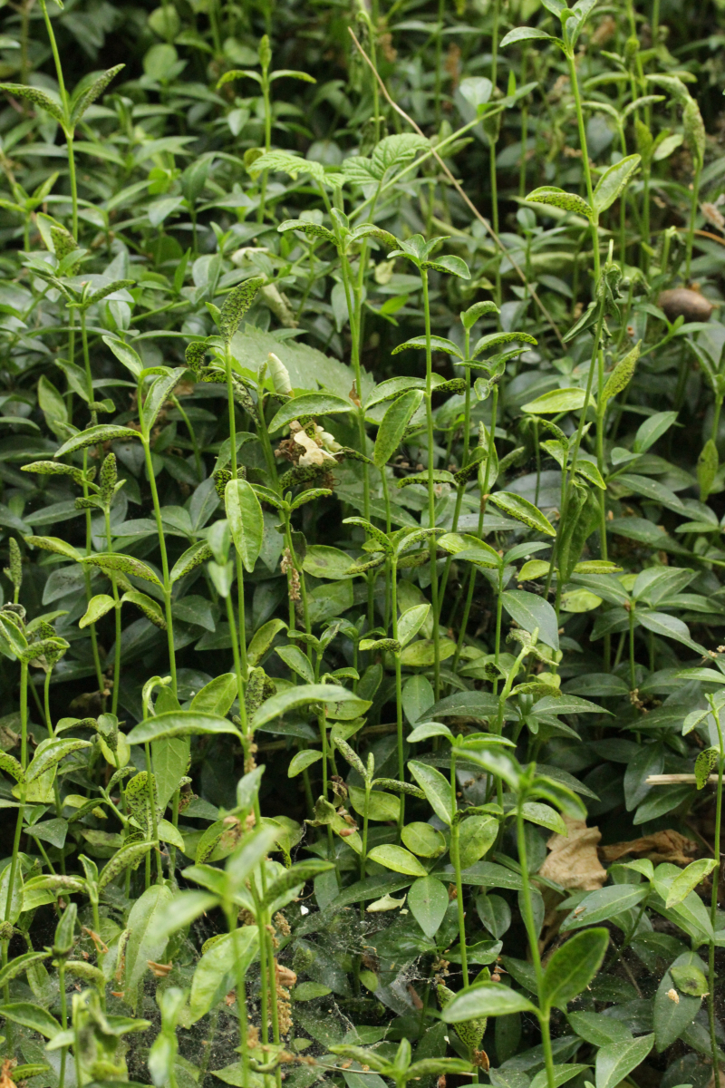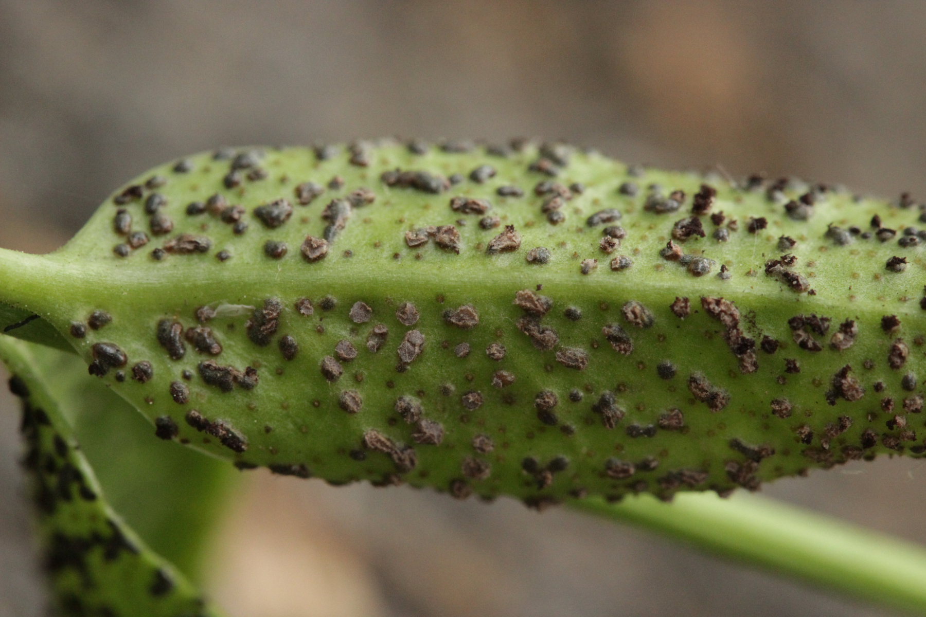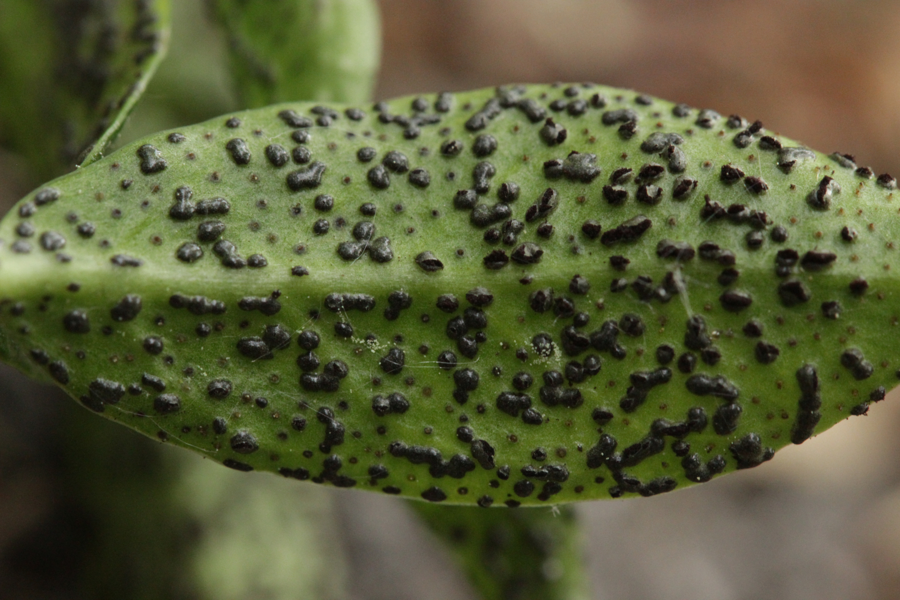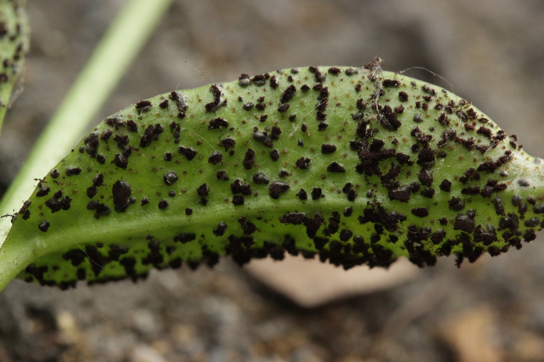 2. Puccinia cribrata ex Vinca minor. Wenn man genau hinschaut, sieht man auch, daß einige Telien leicht violett sind. Das ist ein Befall mit dem Hyperparasiten Tuberculina sbrozzii, der sich mikroskopisch in Form von runden Konidien zeigt.