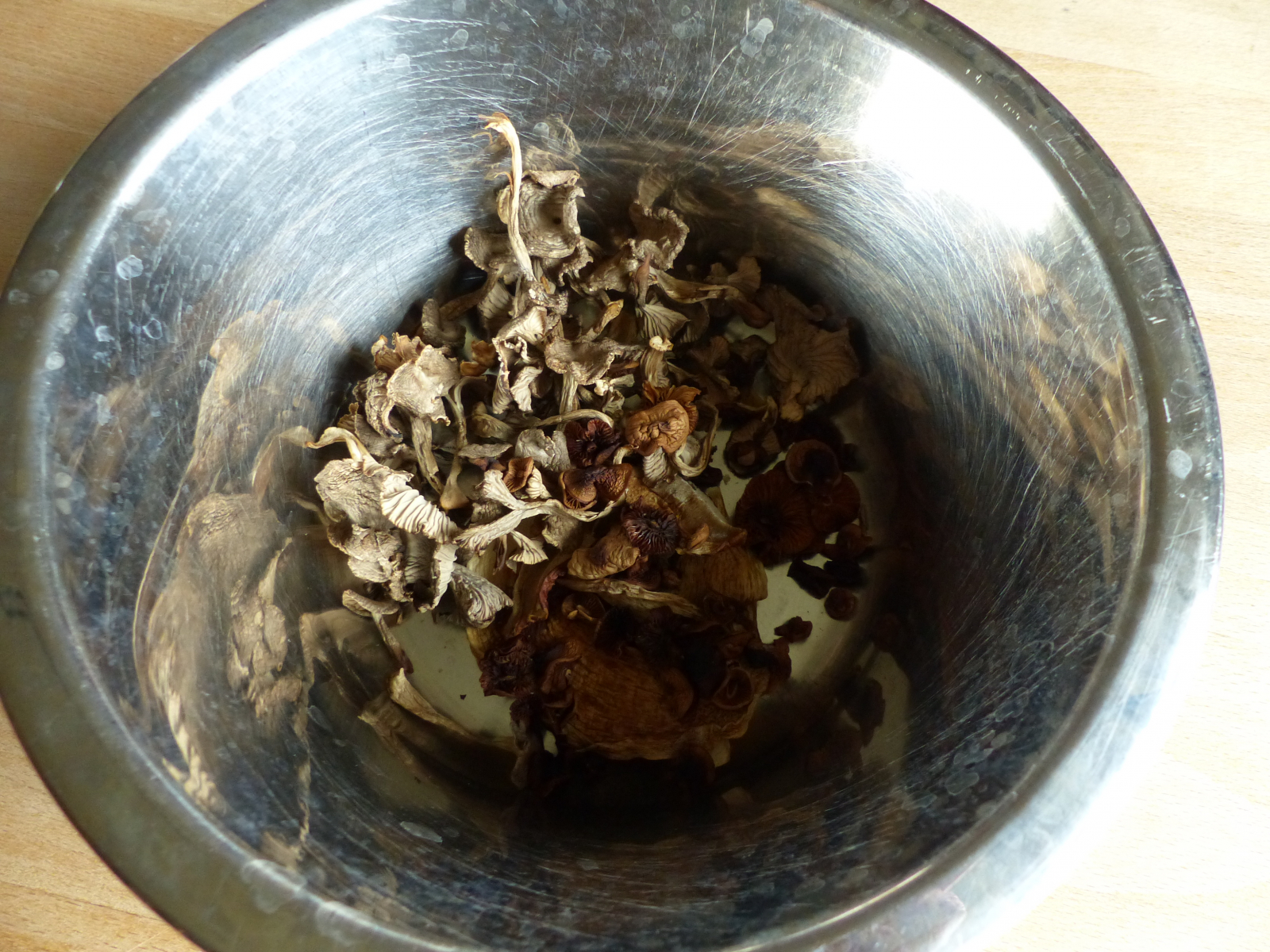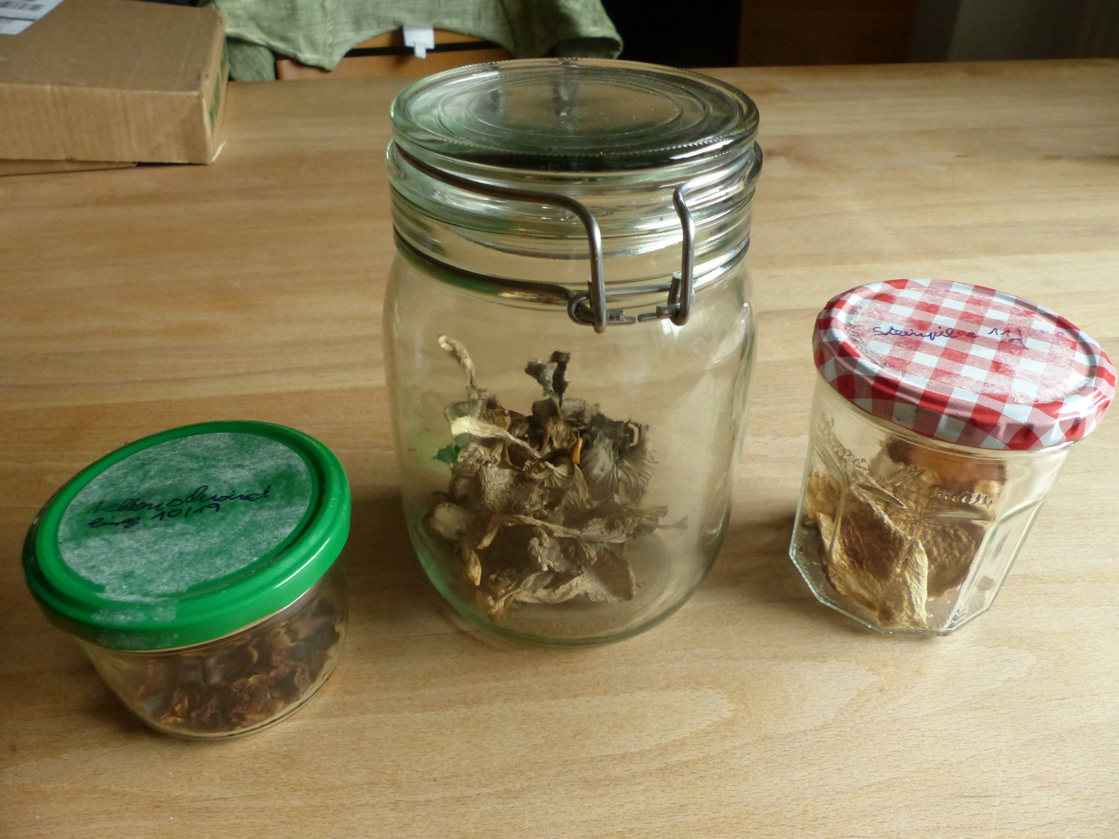 ich hoffe jetzt ganz stark auf die neue Saison und bin daher mit meinen Vorräten aus dem letzten Jahr gestern all-in gegangen. Hier mal die Restbestände an getrockneten Pilzen. Von links nach rechts Nelkenschwindlinge, Tropetenpfifferlinge und Steinpilze.