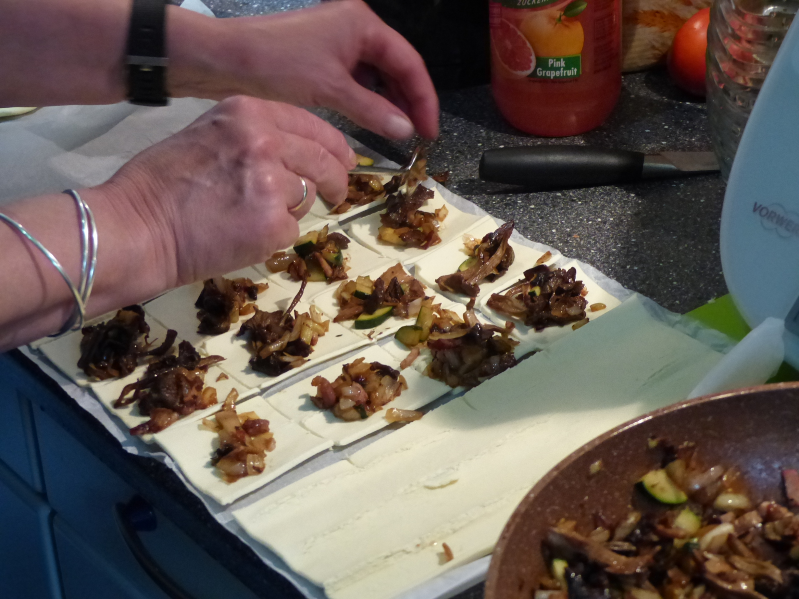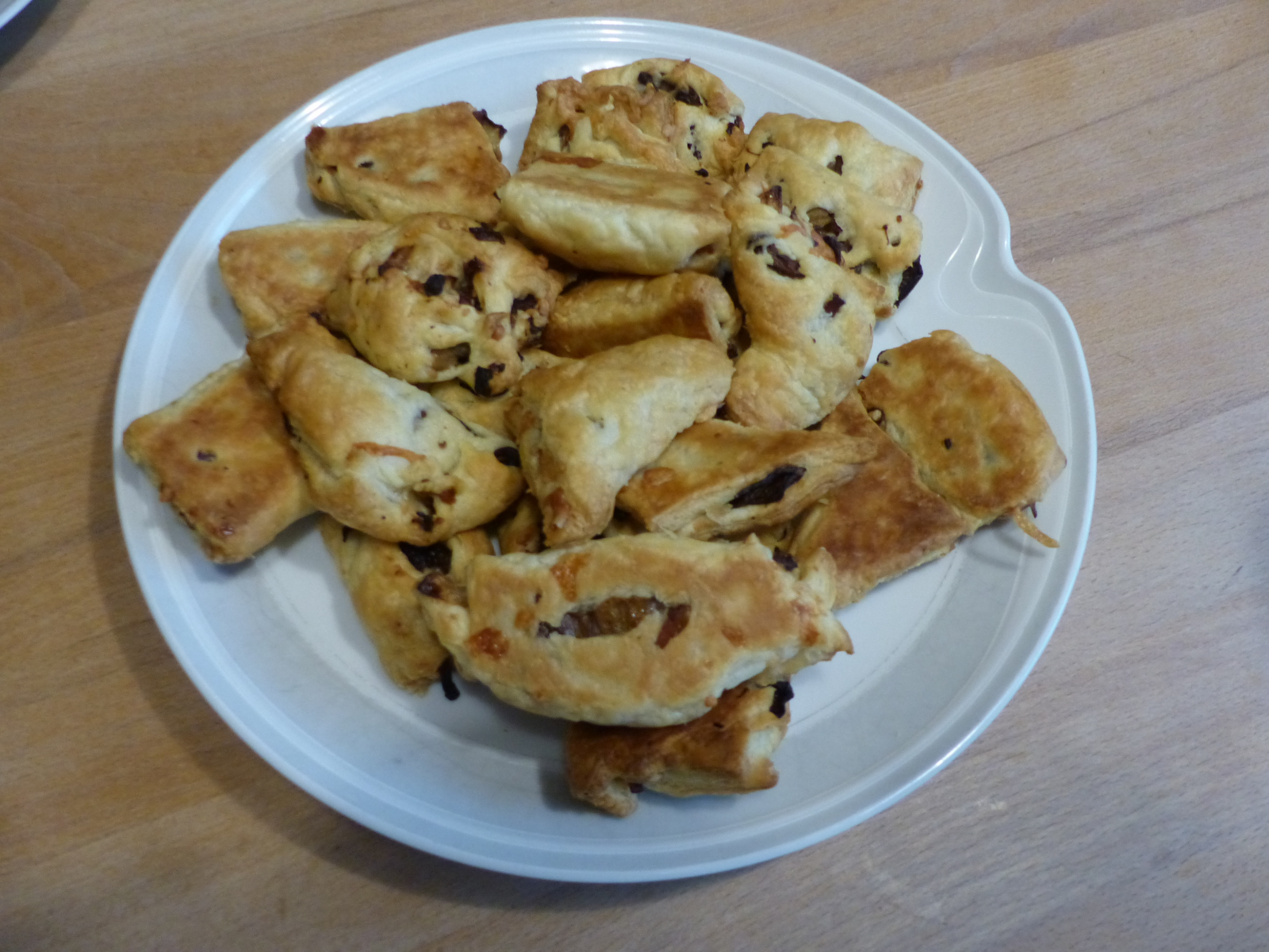 Dann auf Blätterteig legen (Standardprodukt aus dem Supermarkt) und zu Taschen formen: