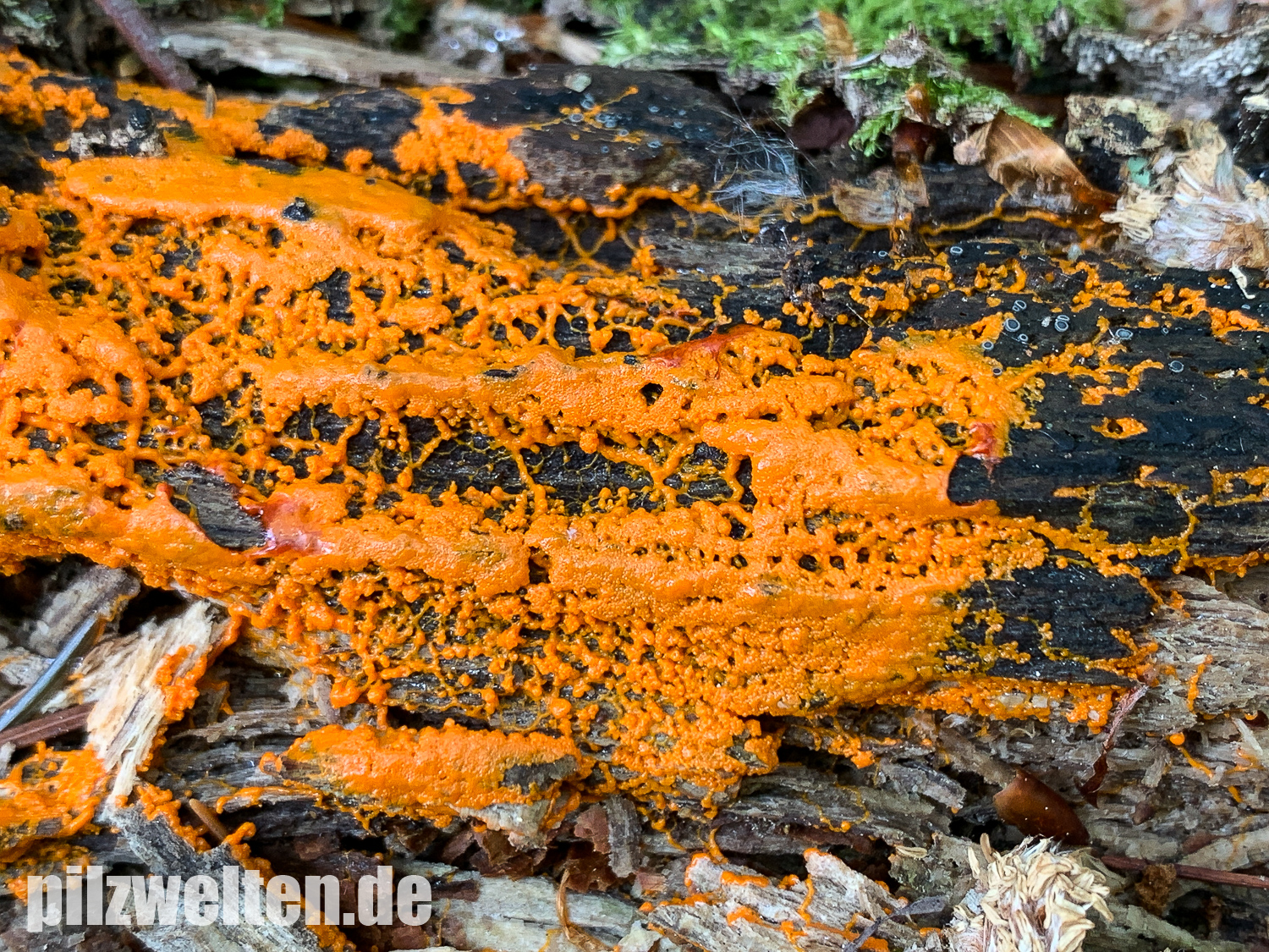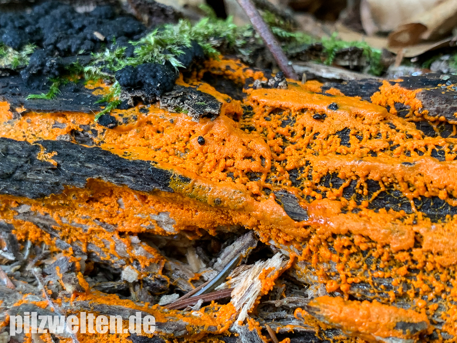 2 b) Ein für uns nicht zu definierender Schleimpilz. Wir vermuten es könnte mal ein Fadenfruchtschleimpilz, Physarum utriculare werden. Was wir im Wald leider nicht wahrgenommen haben sind die Grünspan-Becherlinge, die sich überall um den Schleimpilz verteilt hatten und teilweise auch auf den Bildern zu sehen sind.