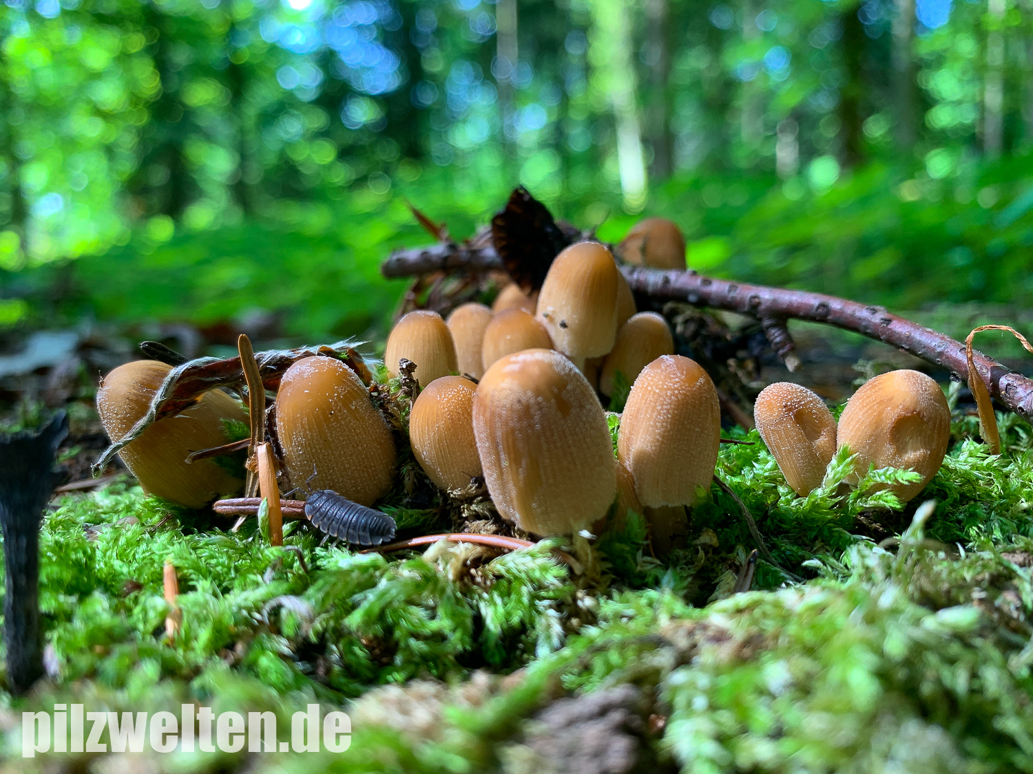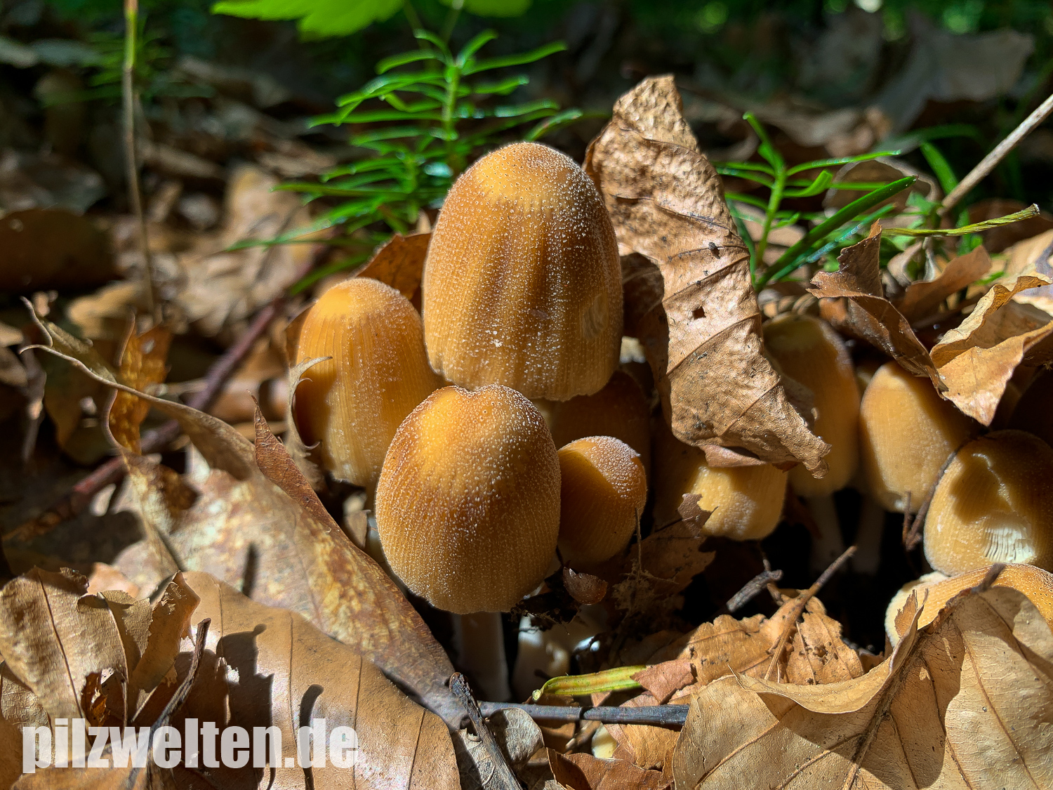 1 d) Höchstwahrscheinlich Glimmertintlinge, Coprinellus micaceus (theoretisch möglich wären auch die sehr ähnlichen Arten wie z. B. der Überzuckerte Tintling, etc.)