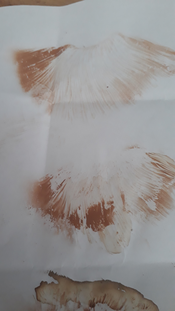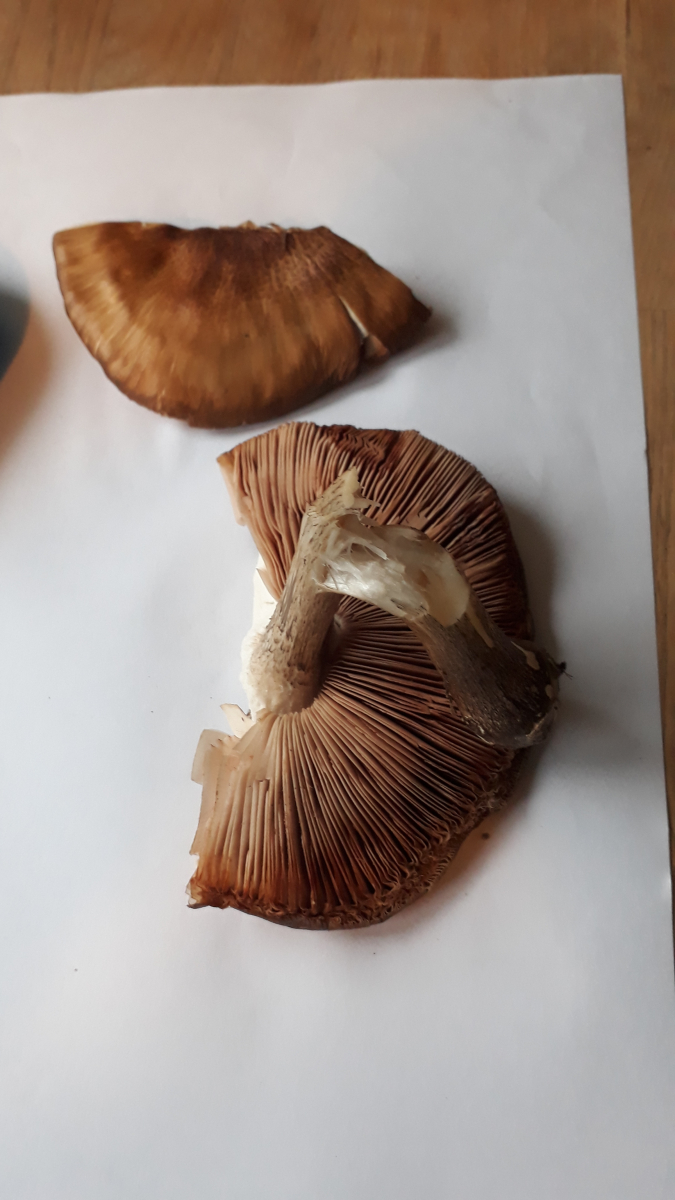 die Sporenpulverfarbe ist rosa. Ich weiß, es wirkt eher braun, doch so sieht mykologisches rosa aus. Spricht sehr für einen Dachpilz.