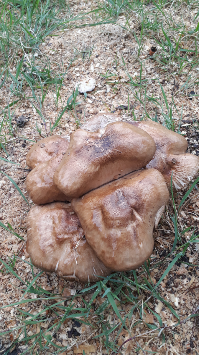 ich habe heute im Garten auf der Brennholzsägestelle, also auf Spänen, folgenden Pilz entdeckt. Könnte ein Ritterling sein. Hat jemand andere Vorschläge?