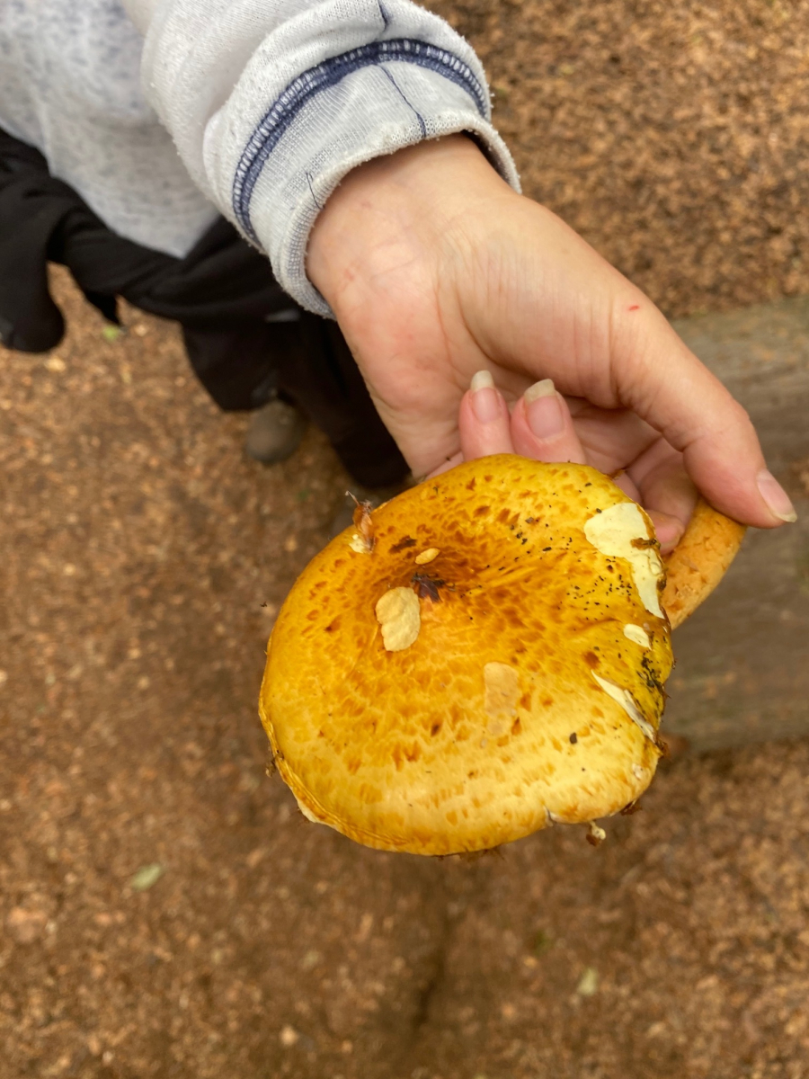 meine Tochter hat mir von einem Reitausflug drei Handyfotos von einem Pilz zukommen lassen, die am Fuße eines Laubbaums, vermutlich Buche, wuchsen. Ich hätte auf einen der Goldfellschüpplinge getippt, aber ist es da noch nicht zu früh? Das Pferd konnte nicht weiterhelfen, zeigte keinerlei Interesse (ansonsten ist es sehr verfressen).