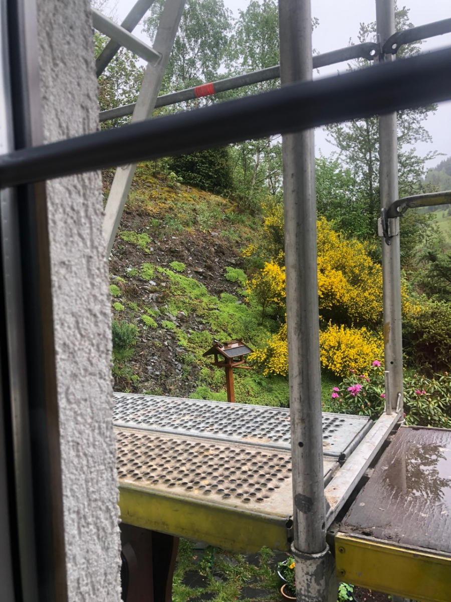 Eigentlich ist auch die sonst ziemlich trockene Schieferrücke gerade besonders schön, weil der Ginster blüht. Blöderweise hat man das Gefühl, die Blütenpracht aus dem Knast zu beobachten. Die Rüstung nervt. Ich erinnere mich gerade, warum dieses Foto entstand - eigentlich wegen der Spechte. Die Buntspechte haben sich dank des Borkenkäfers prächtig vermehrt. Sie lungern ganztägig am Vogelhaus. Leider ist kaum etwas davon zu sehen auf dem Foto.