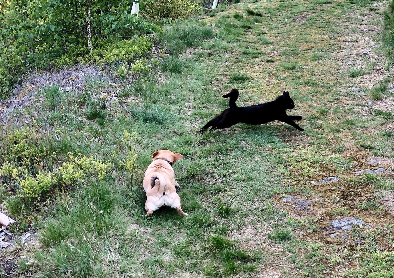 das arme Hündchen. Eine schwarze Katze vor ihm und dann flitzt die noch von links nach rechts. Der wird in der nächsten Zeit nicht viel Spaß am Leben haben.