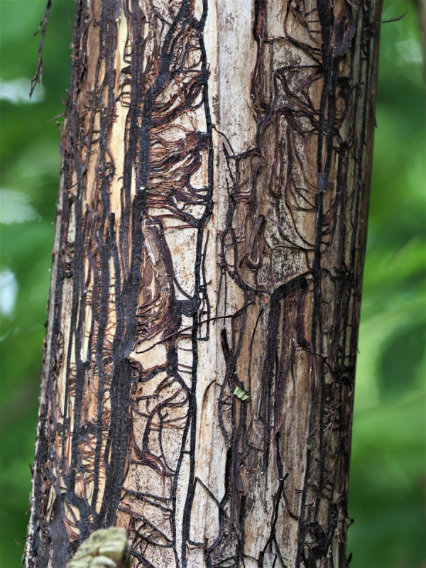 Bei uns findet man seit mehr als einem Jahr unter Spitzahornen einen erschreckend hohen Anteil schwarzstammkranker Exemplare. Gestern fand ich mal wieder so ein Exemplar mit sich ablösender Rinde. Was ich nicht erwartet hätte, war das Zutagetreten eines auffälligen Rhizomorphengeflechtes. Für die Schwarzstammkrankheit wäre dies für mich ein neues, also bisher noch nicht wahrgenommenes Merkmal. So richtig kräftige, unverborgen erkennbare Rhizimorphen kenne ich bisher eigentlich nur vom Hallimasch und vom Hausschwamm.