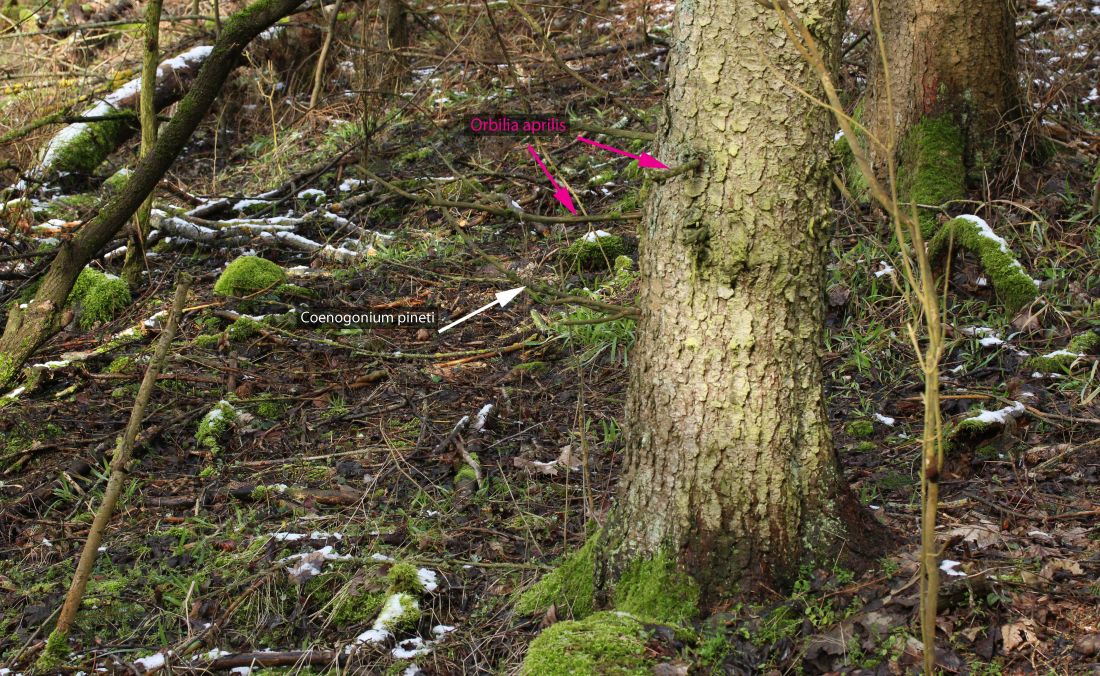 Hier befindet er sich in Gesellschaft zweier winziger muschelförmiger Perithecien. (Mit Pfeilen markiert, dazu gleich mehr).