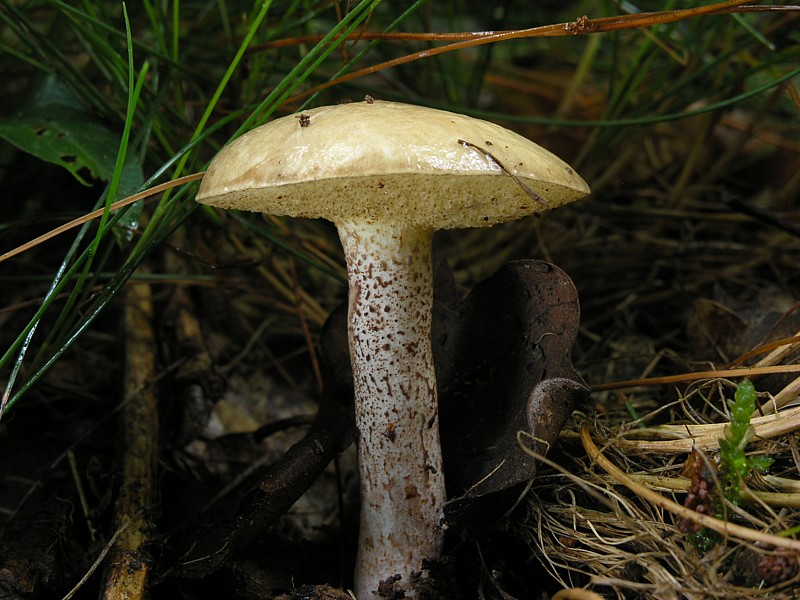 ich habe heute abend einen mir unbekannten röhrling gefunden. während die anderen pilze schon schmoren, habe ich diesen letztlich nicht klar identifizieren können. leider gibt meine digitalkamera nicht viel her, unten sollten 2 verschwomme bilder zu sehen sein. ich habe ihn noch analog fotografiert, aber da dauert die fotoentwicklung einige zeit. die oberseite ist weißlich bis hellgrau, absolut keine tendenz zu dunkler farbe oder braun. die röhren sind gelb, der stiel ist überall gleich dick, weiß und rot gesprenkelt.