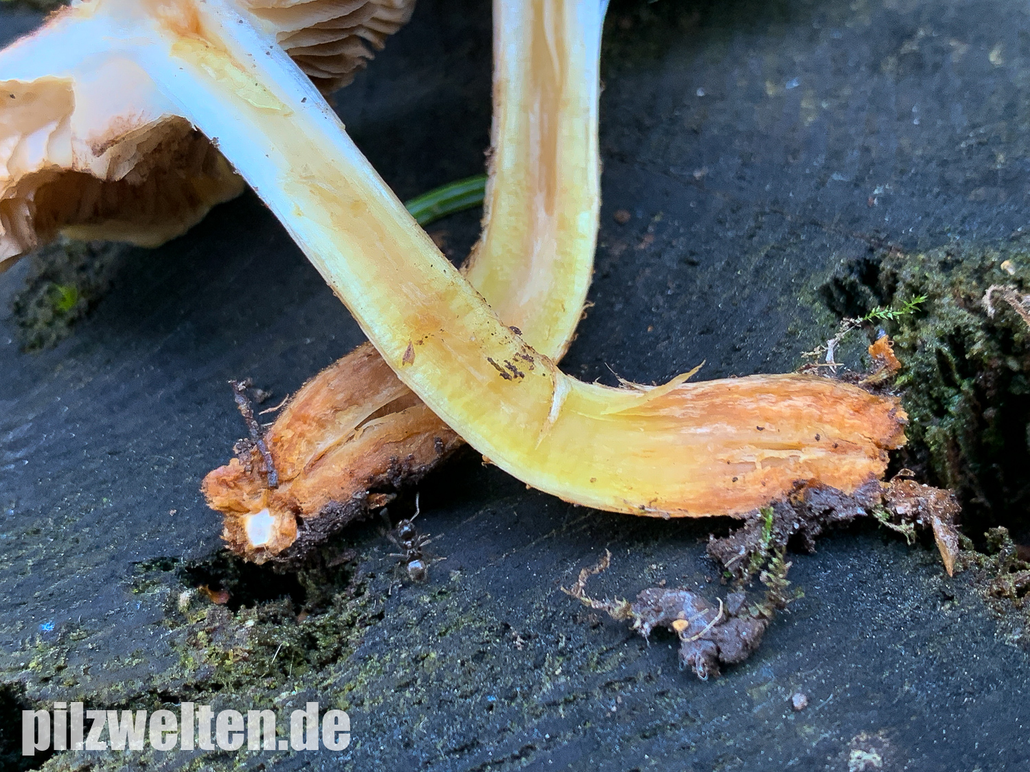 - Fleisch im Schnittbild beim Stiel auffallend gelblich, zur Stielbasis hin aber eher Orange