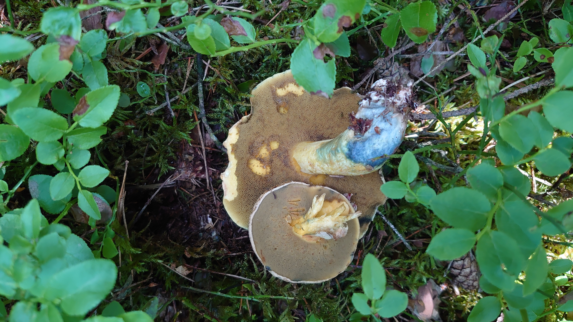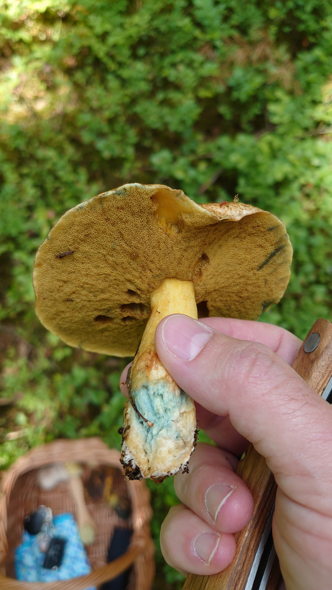 Ich habe gestern in einem Mischwald ca 50 Meter von einem Flockenstieligen Hexenröhrling entfernt an einem leichten Hang einen sehr schönen blauenden Röhrling entdeckt, den ich aber nicht so recht zuordnen kann. Mir waren hier starkblauender Röhrling oder Kornblumen Röhrling eingefallen, wobei ich leider keinen Querschnitt gemacht habe und dadurch leider nicht weiß, ob der Stiel gekammert ist.
