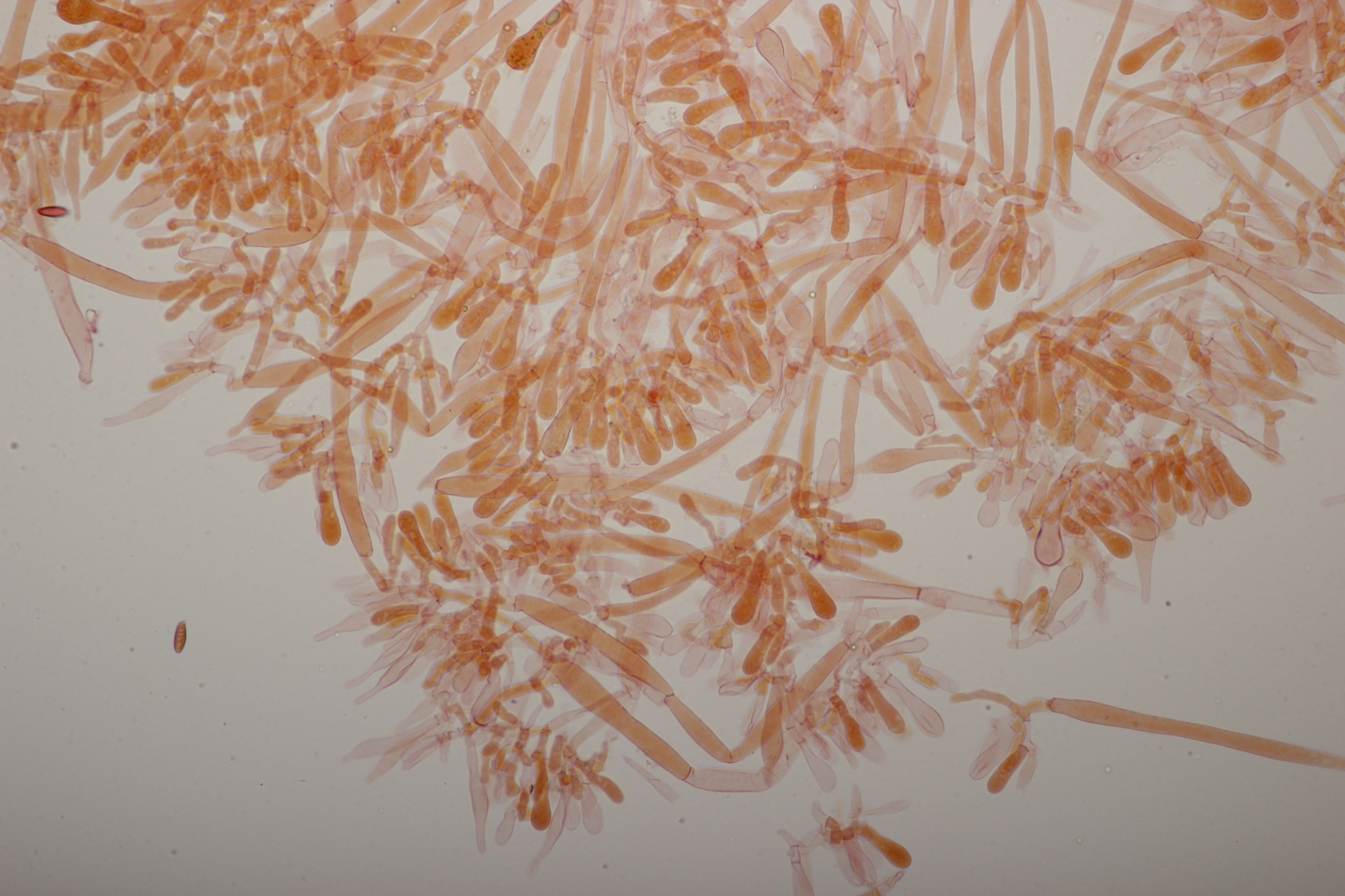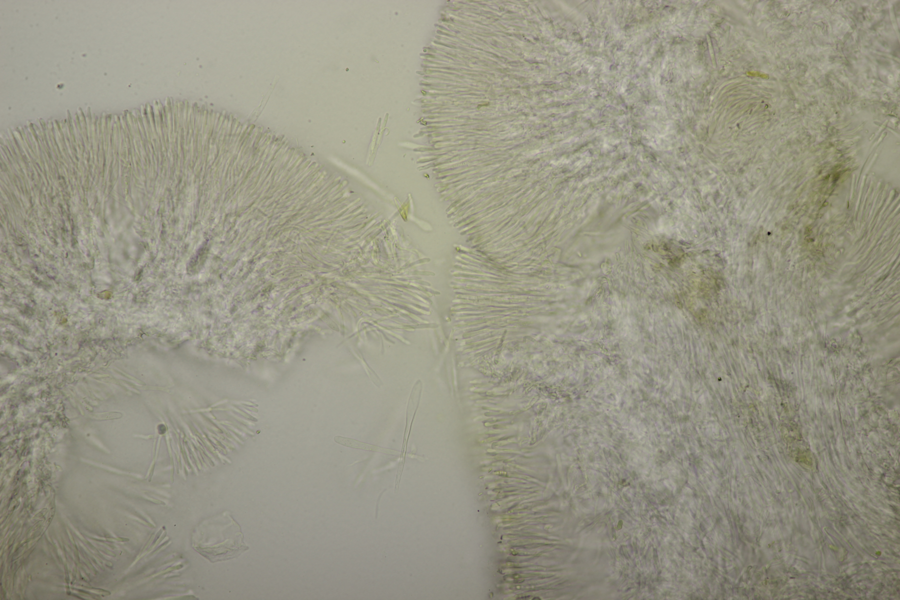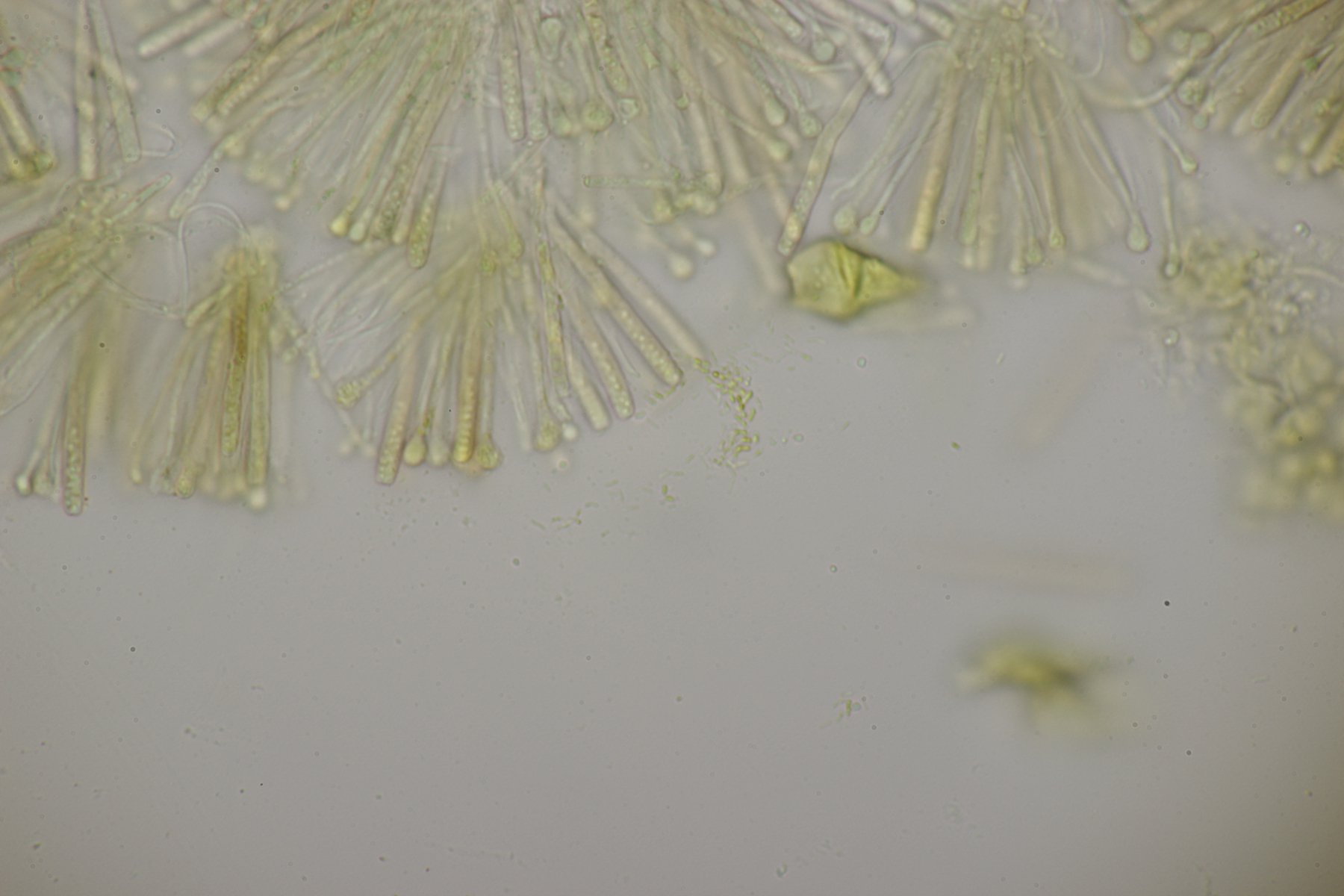 5. Auf einem abgestorbenen Typha-Stängel, der feucht lag, fand sich dieser weiße Belag. Mein erster Gedanke war einer der aquatischen Hyphomyceten, aber im Mikro waren dann Strukturen sichtbar, die zu einer Corticiaceae passen. Schnallen gab es reichlich, reife Basidien waren nicht vorhanden. Interessanterweise war der ganze Fruchtkörper voll mit Sporen, die an Tomentella erinnern.