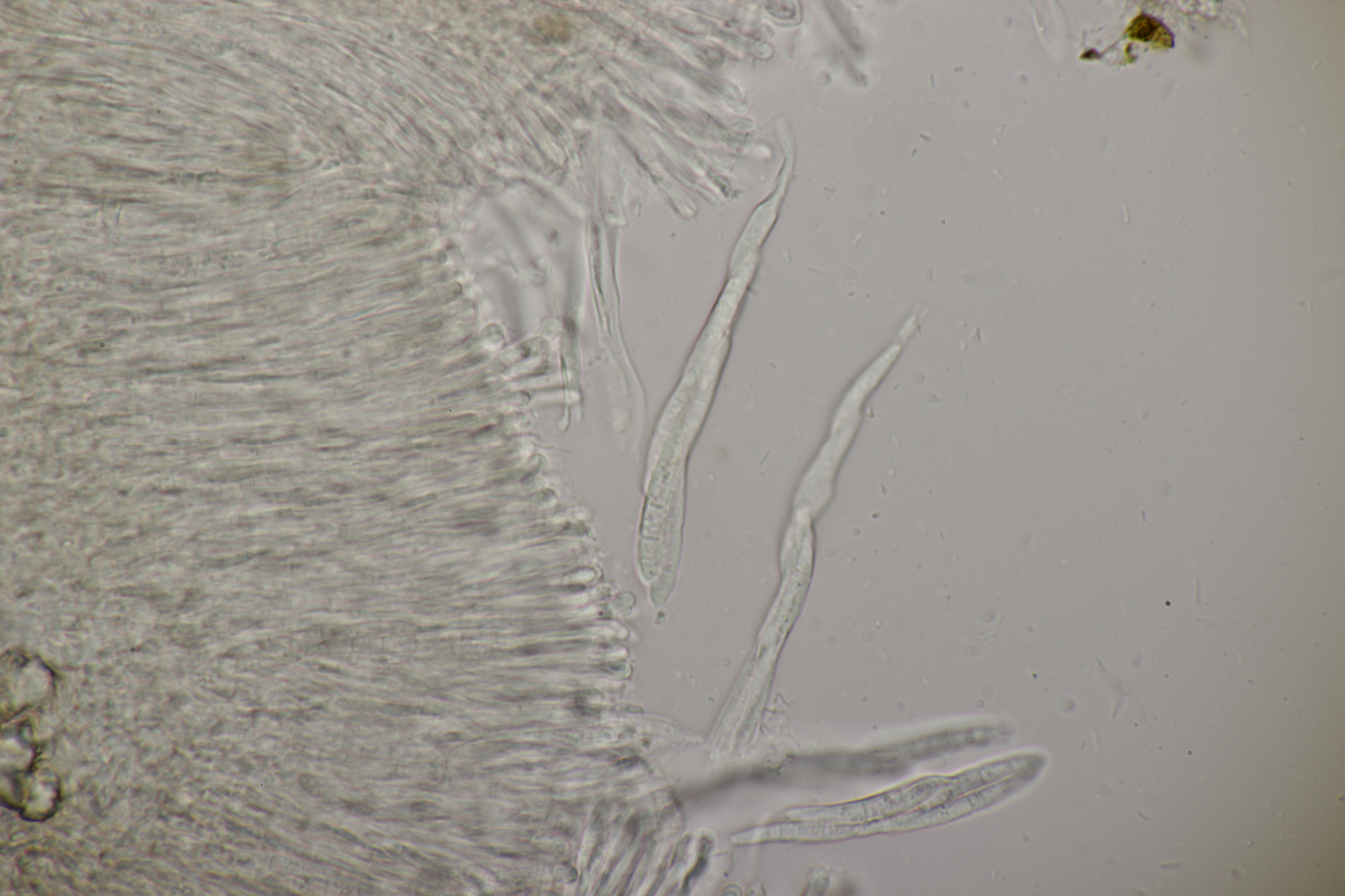 2. Am Nachmittag waren Jochen und ich dann alleine unterwegs. So mußte ich dann diesen Täubling dann mitnehmen. Geruch unbedeutend, Geschmack mild, unter Betula, Alnus, Pinus, mit Guajak in Sekunden eine starke Reaktion, mit Eisensulfat schwach rosa, Sporenpulver IIb-c, Sporen (8.8+-0.8) µm x (7.0+-0.9) µm, Huthaut mit SV+ Zystiden, ansonsten sehr zäh, so daß das Präparat in Kongorot nicht sonderlich ansehnlich wurde. Da Jochen und ich dann erstmal keine Idee hatten, haben wir Karl gefragt. Der war sich sicher, daß er diesen Täubling noch nie gesehen hat und hat Felix Hampe gefragt, der unserem Fund den Namen Russula fusconigra verpaßte. Der ist sonst auch schon mal rosaweinrot und wurde linksrheinisch das letzte Mal 1984 gefunden.