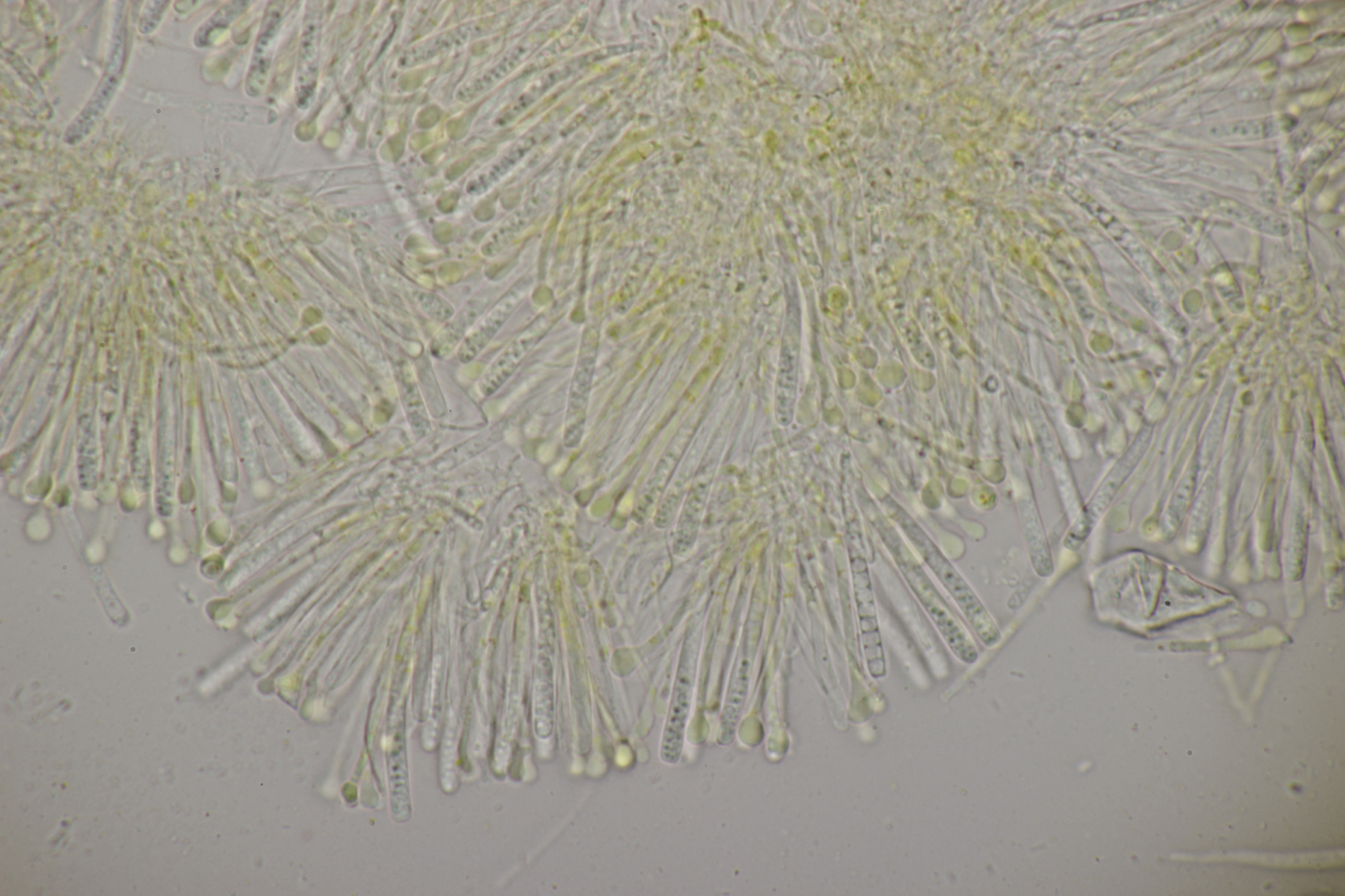 6. Auch an Rohrkolben fand sich diese Mollisia, die dann mit Hans' Hilfe den Namen Mollisia mediella bekommen hat. Sporen (22-27) µm x 3 µm, dreifach septiert, Kristalldrusen vorhanden, mit KOH eine gelbe Reaktion der Paraphysen, ein Ascus mit blauer Lugolreaktion, die anderen Asci ohne Reaktion.