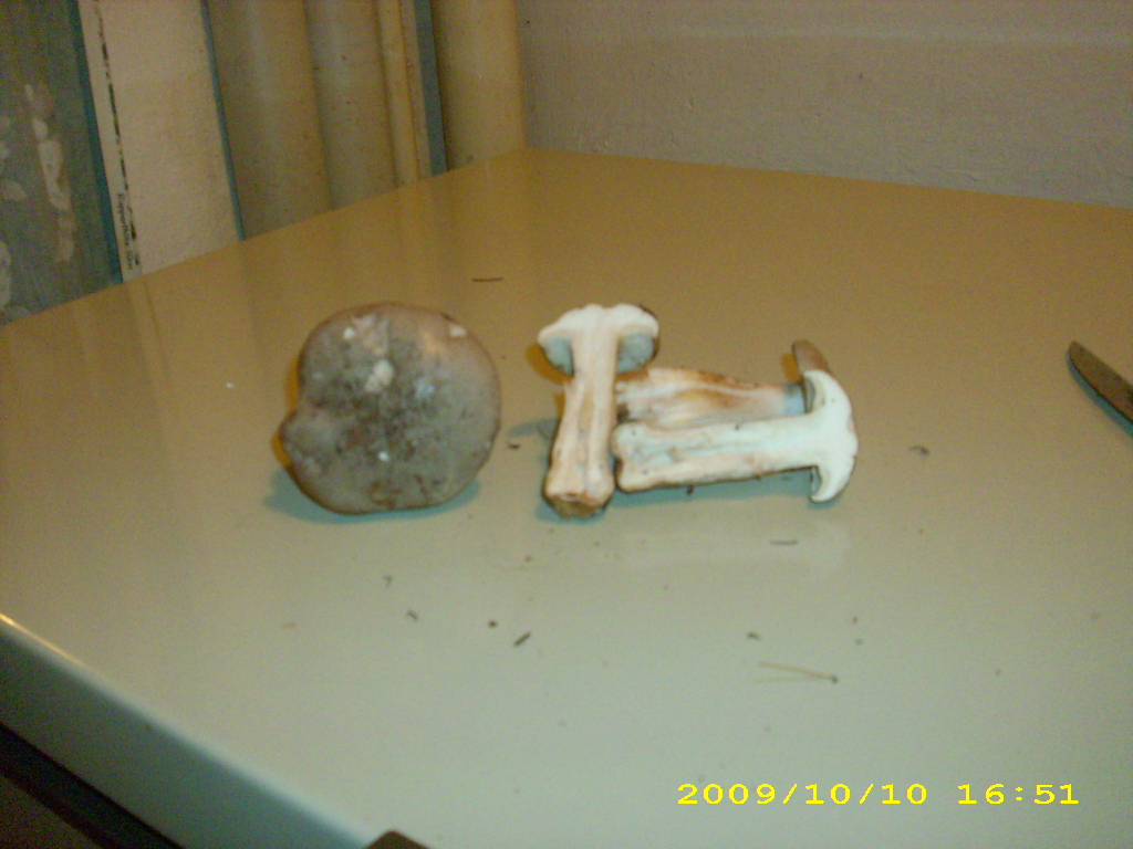 Es sind Lamellenpilze, die Lamellen sind weiß, weich, nur leicht am Stiel angewachsen. Sie haben kaum Verzweigungen und stehen sehr eng. Der Hut ist eher grau, matt glänzend, in der Hutmitte leicht schuppig. Die haut lässt sich nur schwer lösen. Der Hutrand ist glatt, nach unten gewölbt, im Durchmesser 4 - 9 cm. Der Stiel ist fast weiß, nach unten knollenartig verdickt und innen hohl. Durchmesser 2 - 4 cm. Der Schnitt verfärbt nicht. Der Geruch ist würzig, pilzig und mit leichter Anisnote. Der Lecktest am Schnitt ergab einen milden Geschmack, ganz leicht bitter.