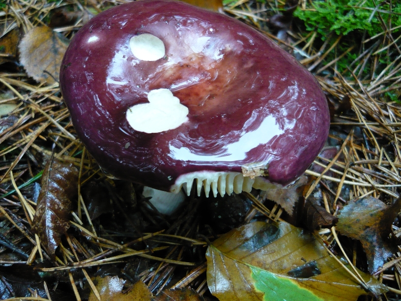 Hut: Violett, glatt, Seiten deutlich nach unten gewölbt, in der Hutmitte bei größeren Exemplaren eine kleine Vertiefung.