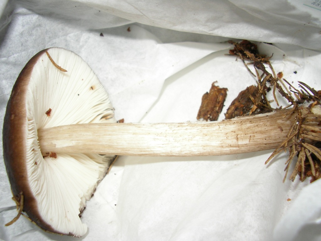 Stiel: cm 10 cm weiß-grau längsfaserig, lässt sich leicht vom Hut ablösen, wässrig bei Druck