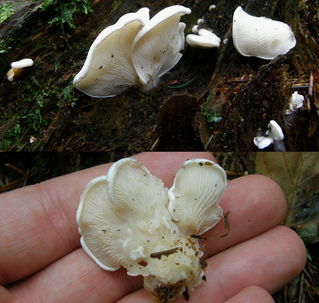 Ja, der Ohrlöffelseitling, Phyllotus porrigens, hat tatsächlich etwas anders geformte, mehr zungenförmige Hüte, ist praktisch stiellos und deutlich weiss. Er wächst an Nadelholz und Ich hab den bisher auch nur in höheren Lagen (>600m) gefunden.