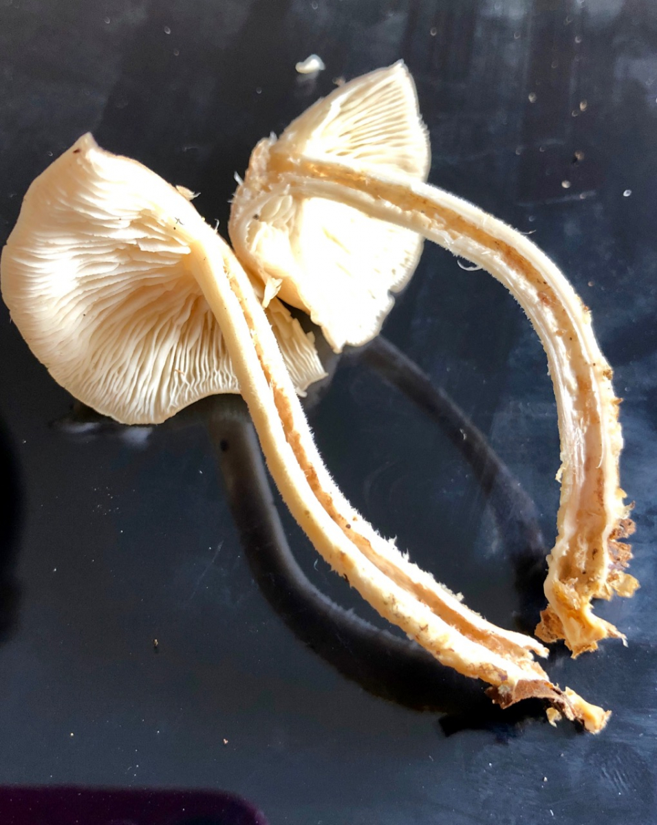 Die jüngeren Exemplare Bild 3 und 4 waren teilweise im Wachstum stecken geblieben und verschrumpelt. Bei diesen Pilzen war die Huthaut runzelig und etwas gerieft, ebenso der Stiel. Hutrand fast weiß, ebenso wie die Stielbasis, zur Stielspitze hin ins Ocker übergehend, ebenso wie zur Hutmitte. Auf dem Hut winzige helle Schüppchen/Flecken. Die Stiele waren deutlich gerieft und in einem Fall verdreht, wie beim Spindeligen Rübling. Lamellen cremeweiß. Geruch wie oben.