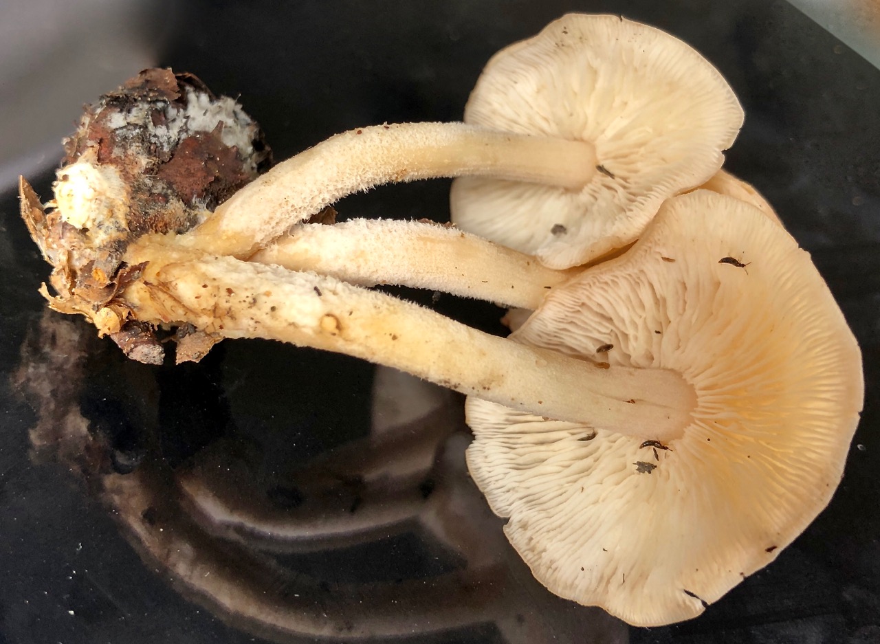 Die jüngeren Exemplare Bild 3 und 4 waren teilweise im Wachstum stecken geblieben und verschrumpelt. Bei diesen Pilzen war die Huthaut runzelig und etwas gerieft, ebenso der Stiel. Hutrand fast weiß, ebenso wie die Stielbasis, zur Stielspitze hin ins Ocker übergehend, ebenso wie zur Hutmitte. Auf dem Hut winzige helle Schüppchen/Flecken. Die Stiele waren deutlich gerieft und in einem Fall verdreht, wie beim Spindeligen Rübling. Lamellen cremeweiß. Geruch wie oben.