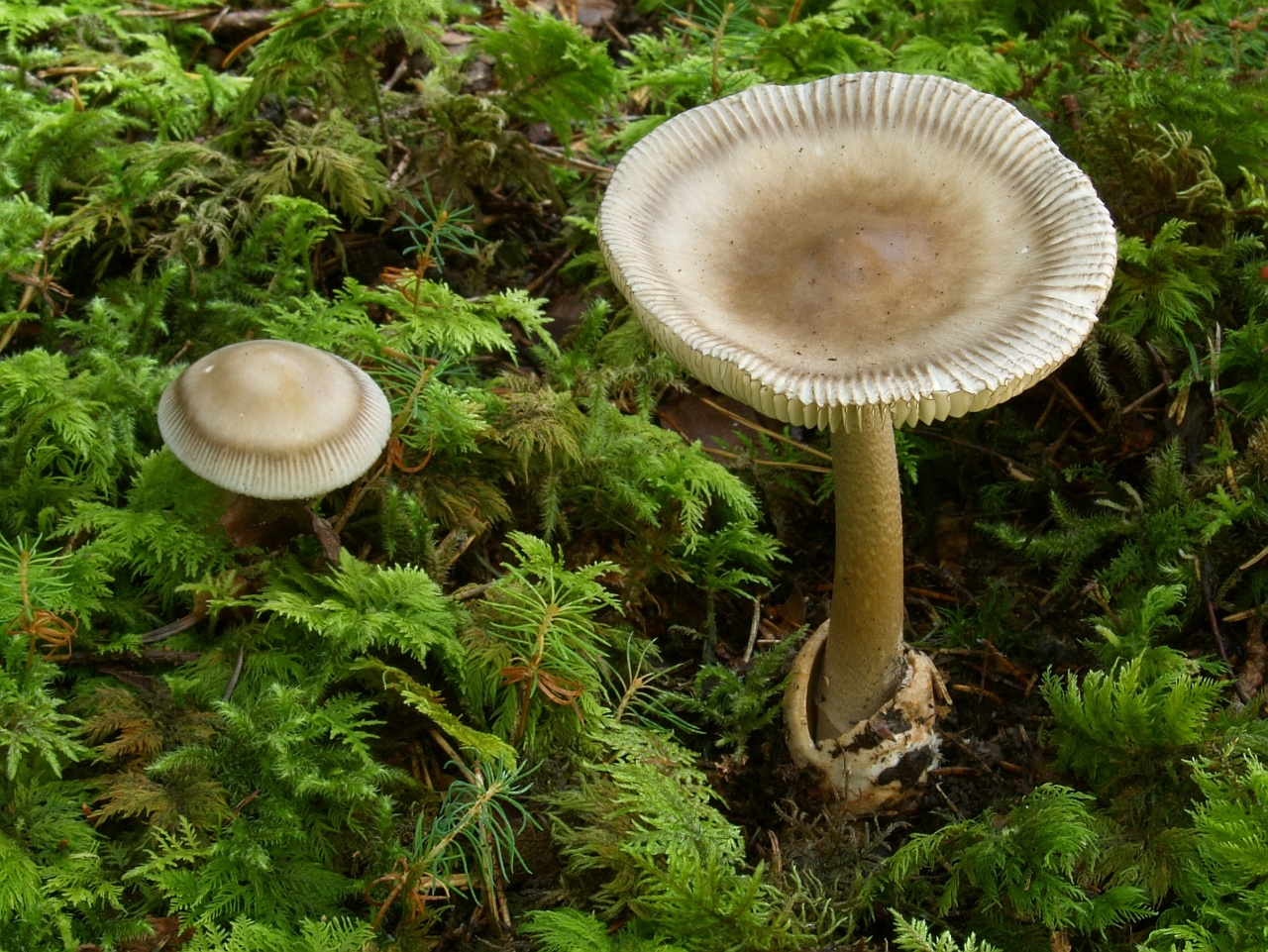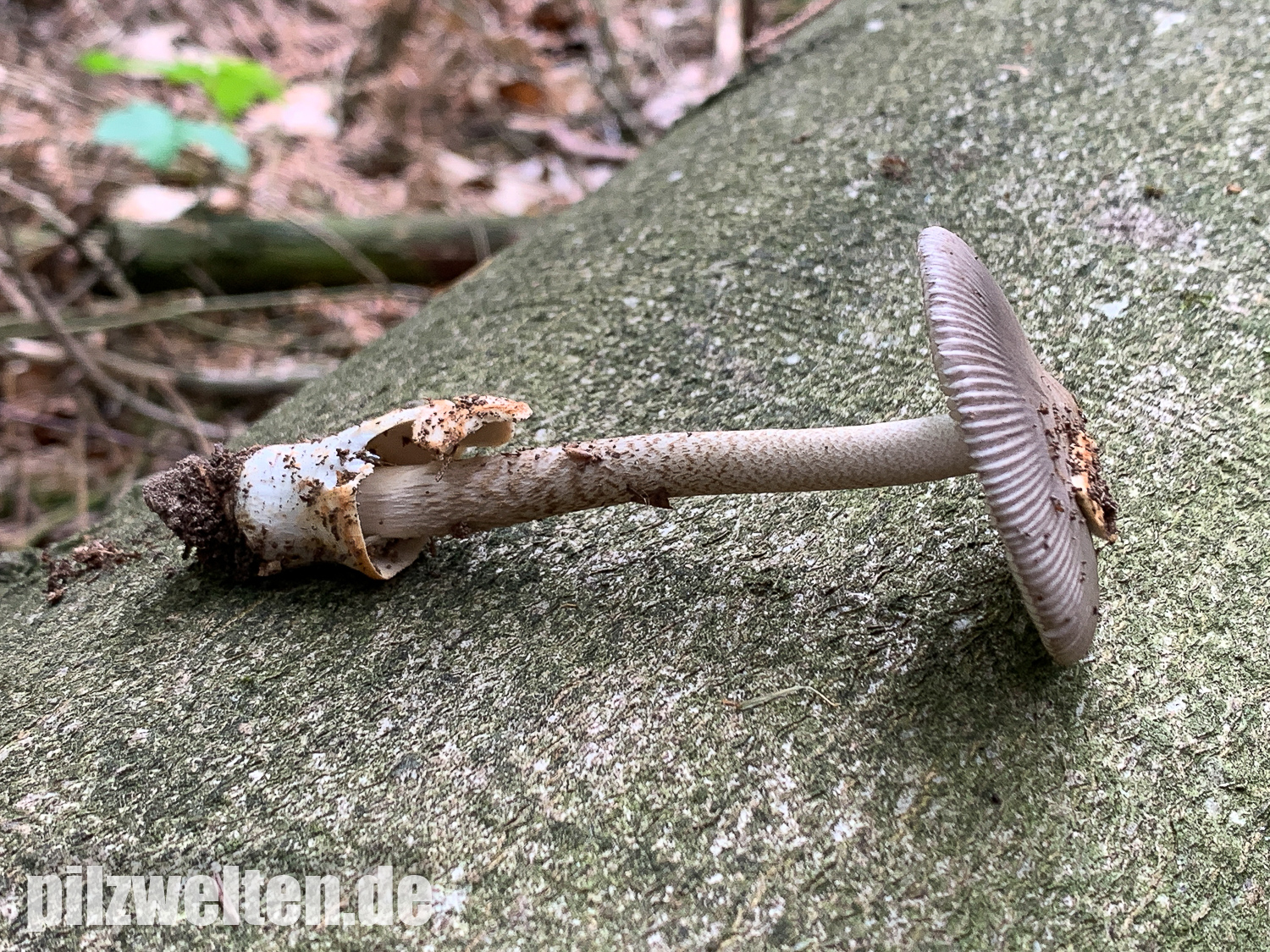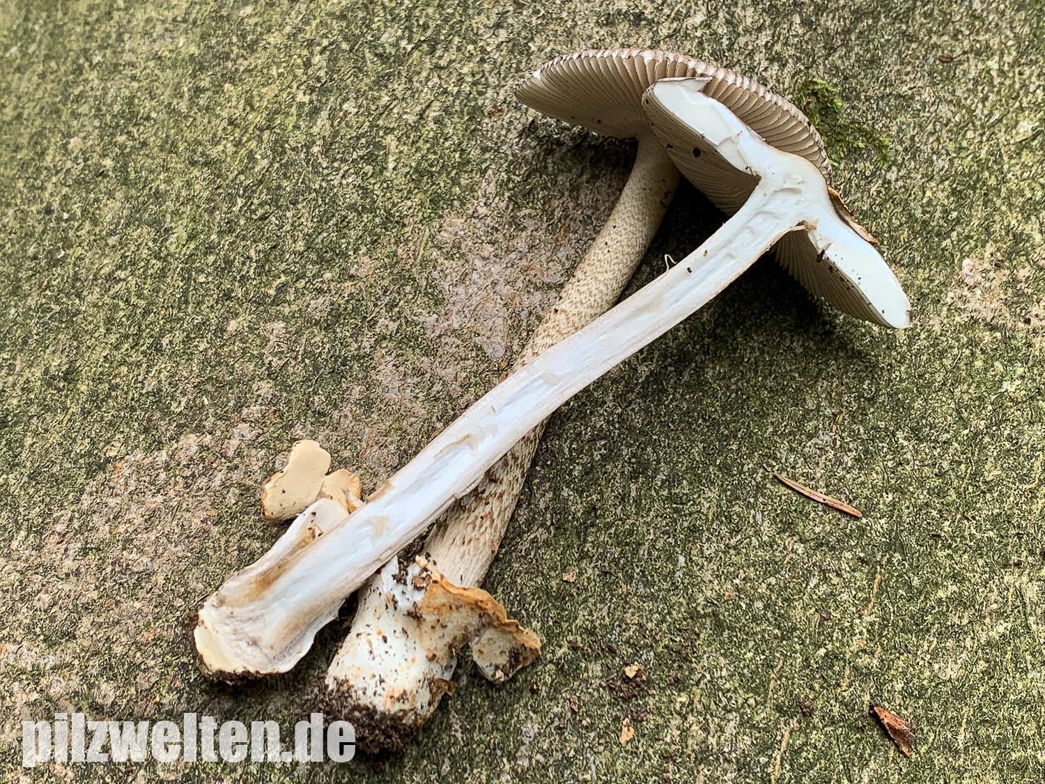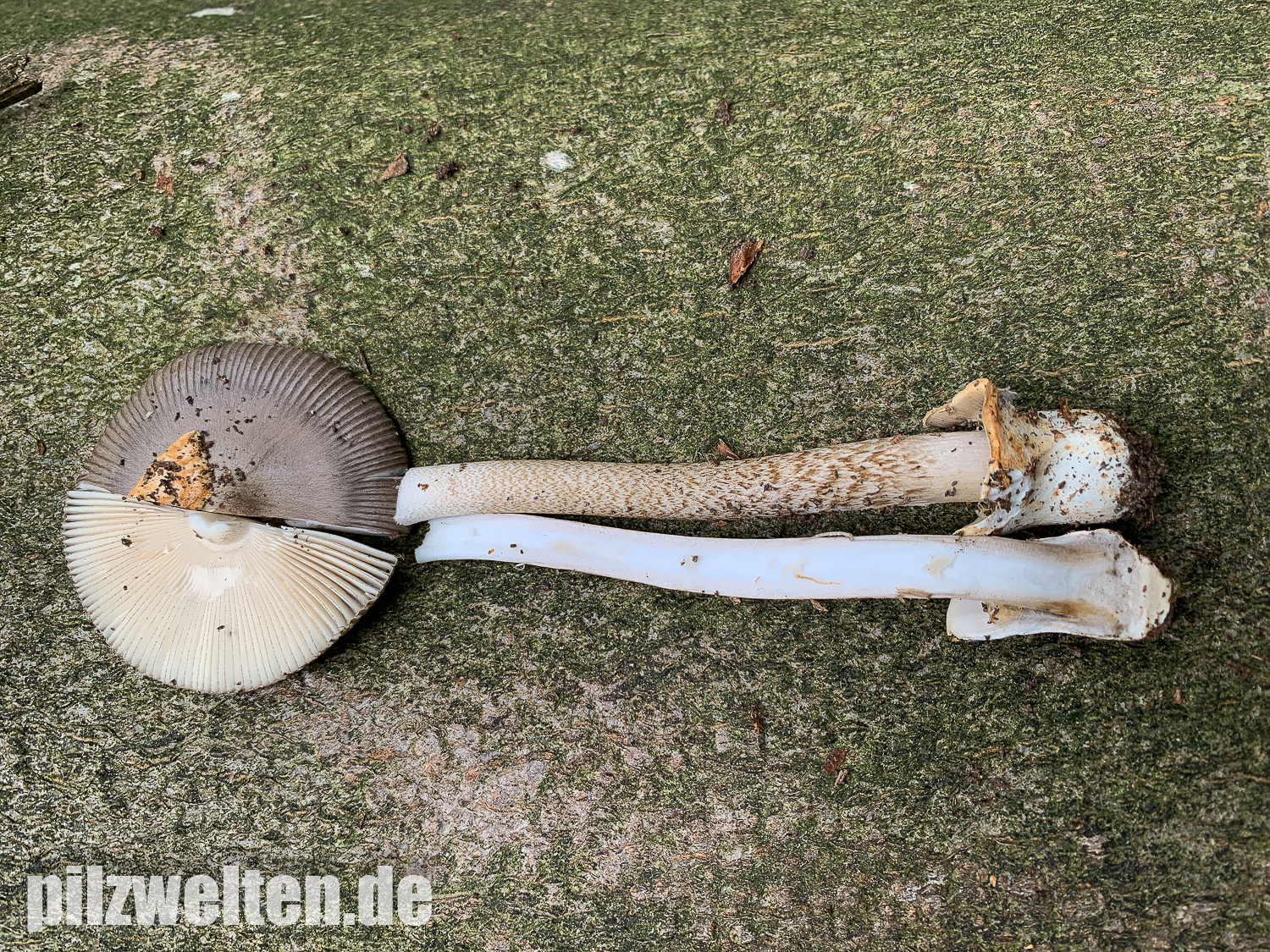 beim folgenden Scheidenstreifling sind wir etwas unsicher in der Einordnung. Für A. battarrae ist uns der Hut viel zu gleichmäßig gefärbt, aber für komplett graue Arten ist uns der Stiel viel zu extrem genattert. Anbei zunächst ein Vergleichsbild, wie wir A. battarrae kennen (links) im Vergleich zum aktuellen Fund: