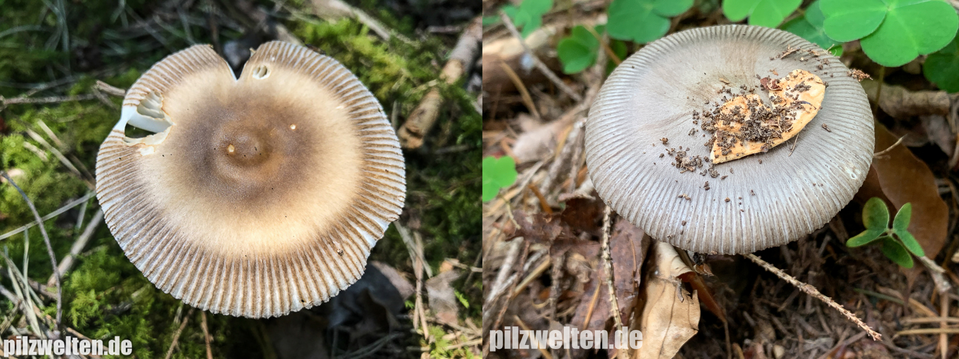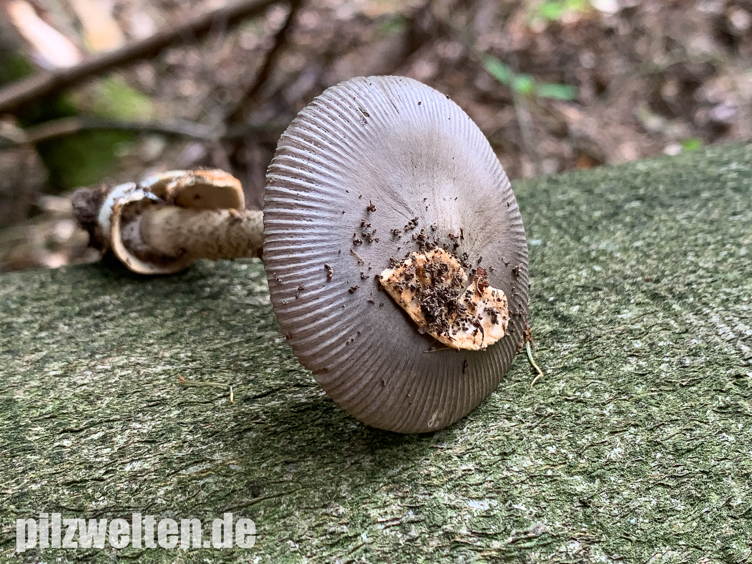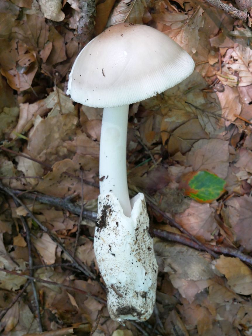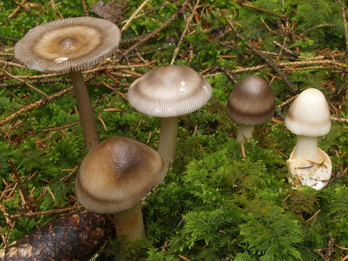 beim folgenden Scheidenstreifling sind wir etwas unsicher in der Einordnung. Für A. battarrae ist uns der Hut viel zu gleichmäßig gefärbt, aber für komplett graue Arten ist uns der Stiel viel zu extrem genattert. Anbei zunächst ein Vergleichsbild, wie wir A. battarrae kennen (links) im Vergleich zum aktuellen Fund: